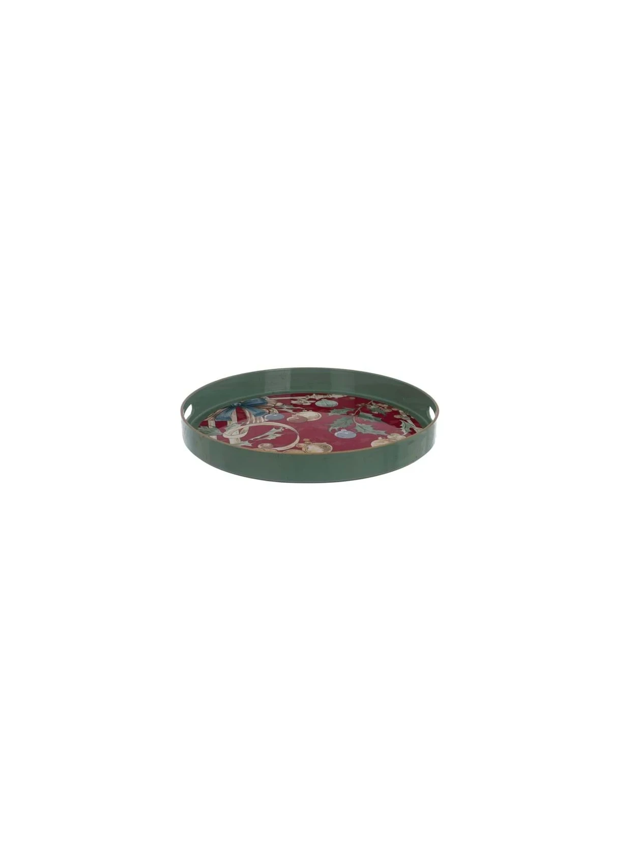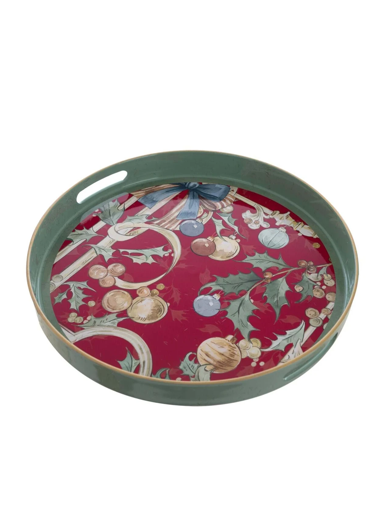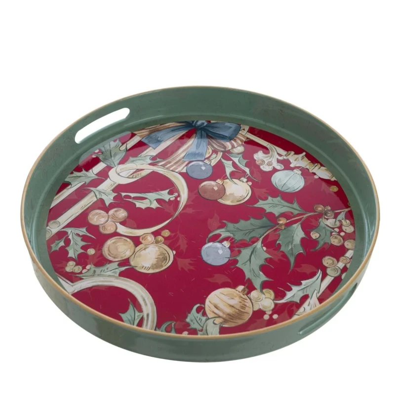 Vassoio rotondo firmato Blanc MariClò della collezione Intrecci di Sogno Ø35 cm. Realizzato in plastica verde con bordo dorato e fondo rosso decorato con motivi natalizi. Eleganza e charme per la tavola delle feste.