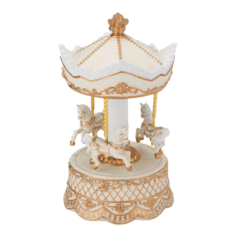 Henriette's Carousel Music Box, Ø12.5 x H.23 cm, made of hand-painted resin, ivory with refined gold details. An elegant Christmas decoration for tables and shop windows.