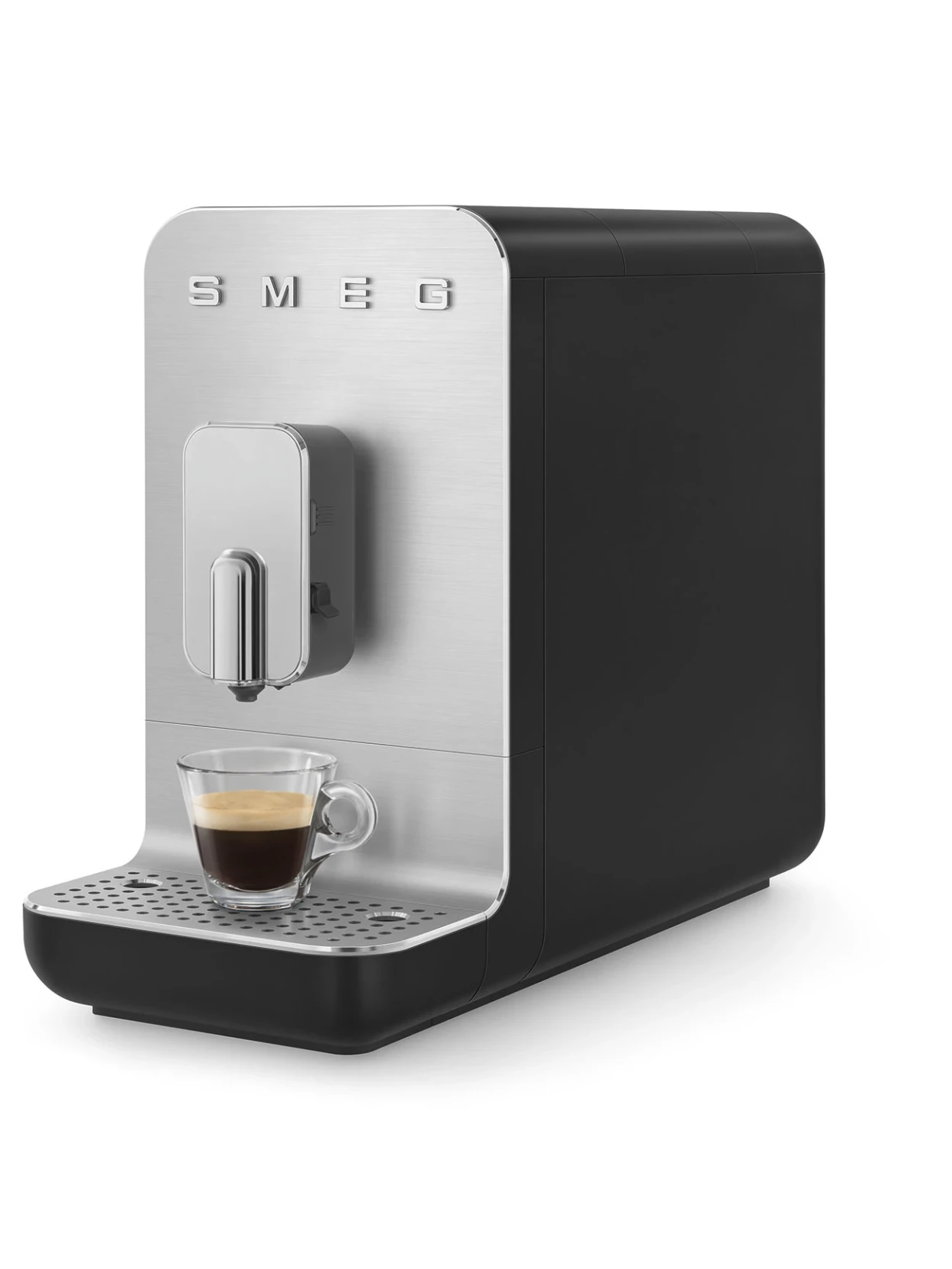 Smeg automatic coffee machine in black: professional performance with an integrated milk system for perfect cappuccinos and lattes. 19-bar pump, integrated grinder, 1.4-liter water tank, multi-beverage system with 5 coffee drinks and 4 milk drinks, plus hot water.