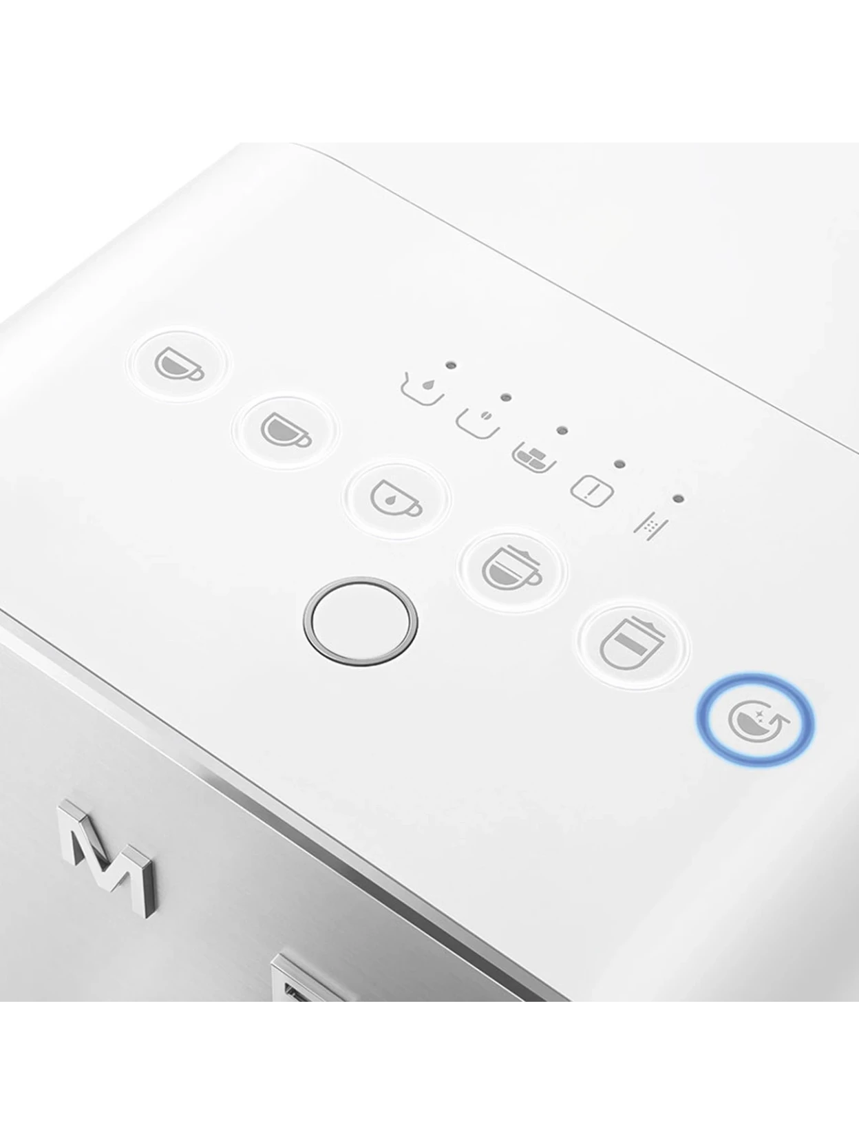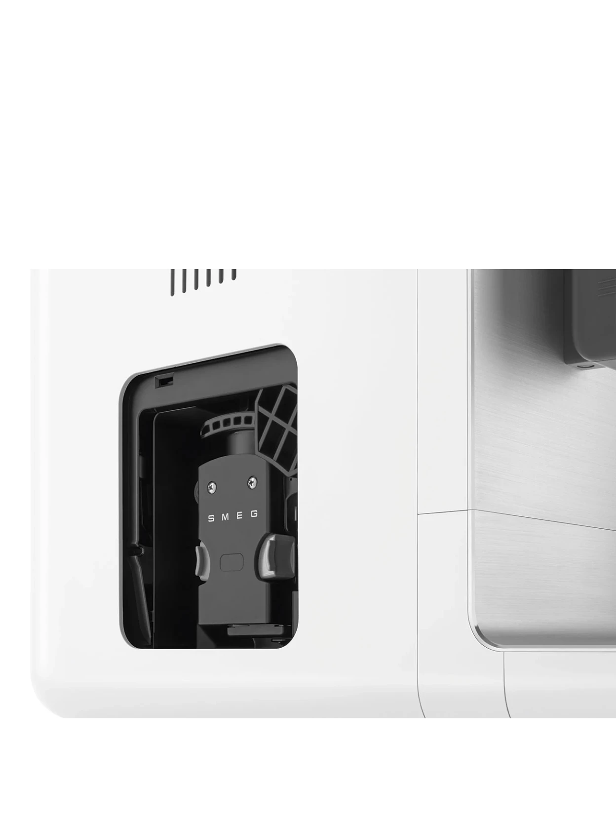Smeg's automatic coffee machine from the Aesthetic collection combines refined design, advanced technology, and practicality, bringing the complete coffee shop experience to your home. The elegant, bright white finish blends seamlessly with any environment, combining aesthetics and functionality.