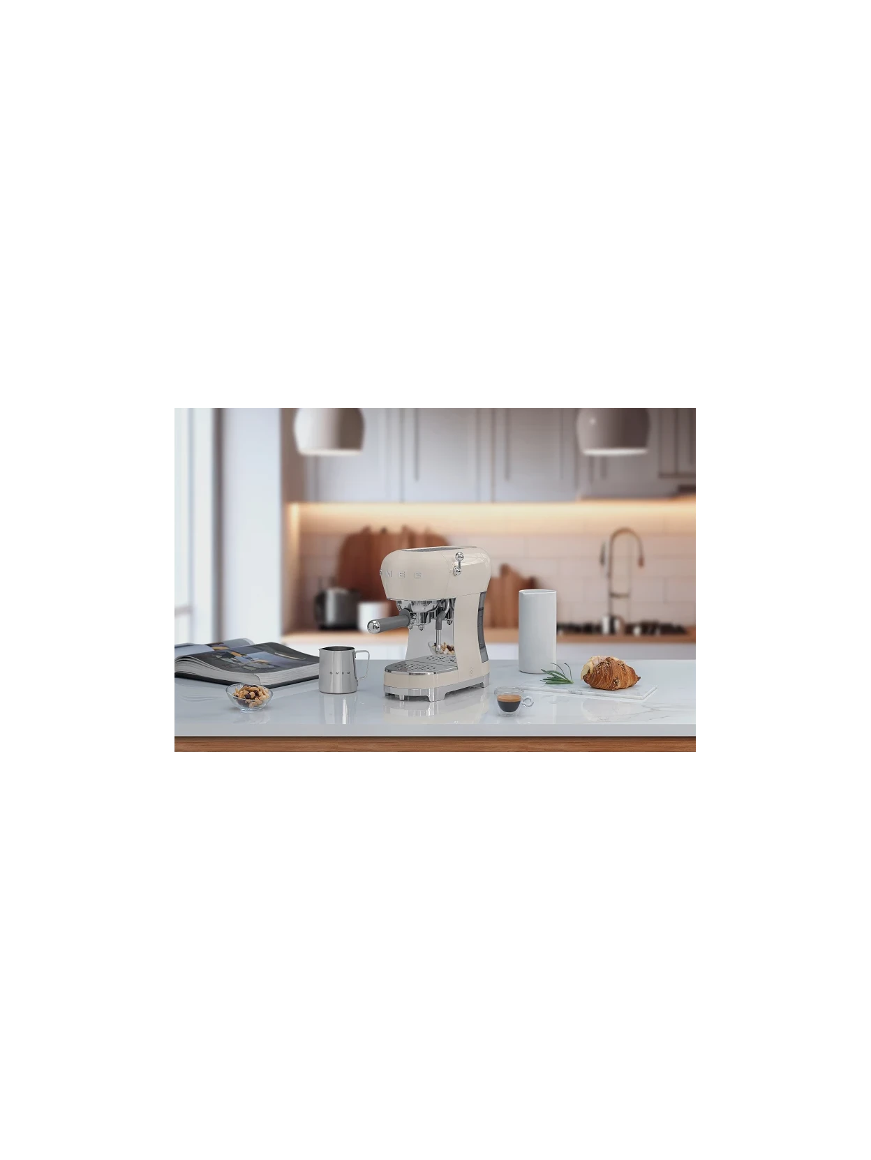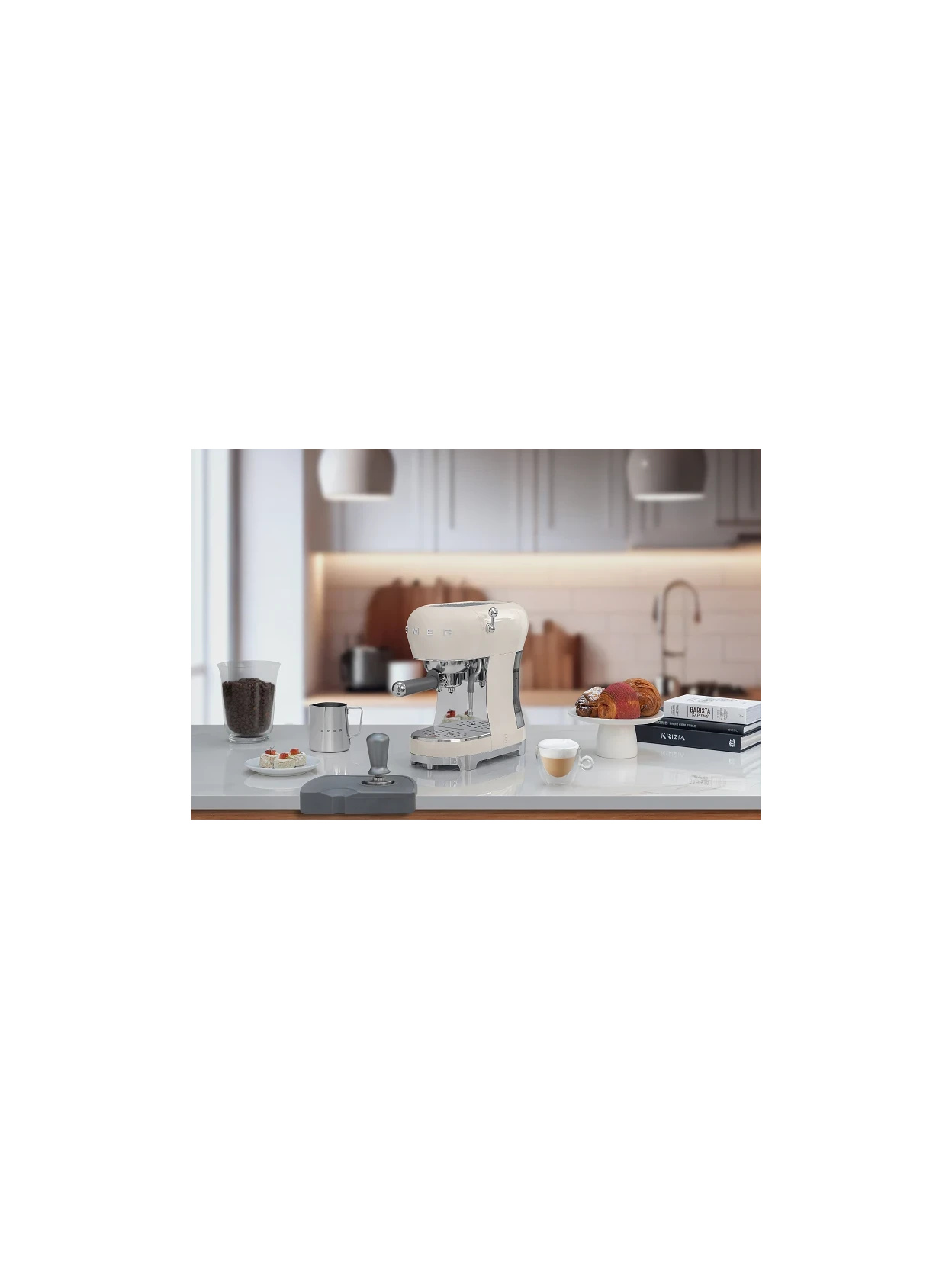 The Smeg Cream manual espresso machine combines iconic 1950s design, Italian quality, and professional performance. The glossy cream finish, paired with chrome details and silver buttons, transforms the appliance into an elegant and refined addition to any kitchen.