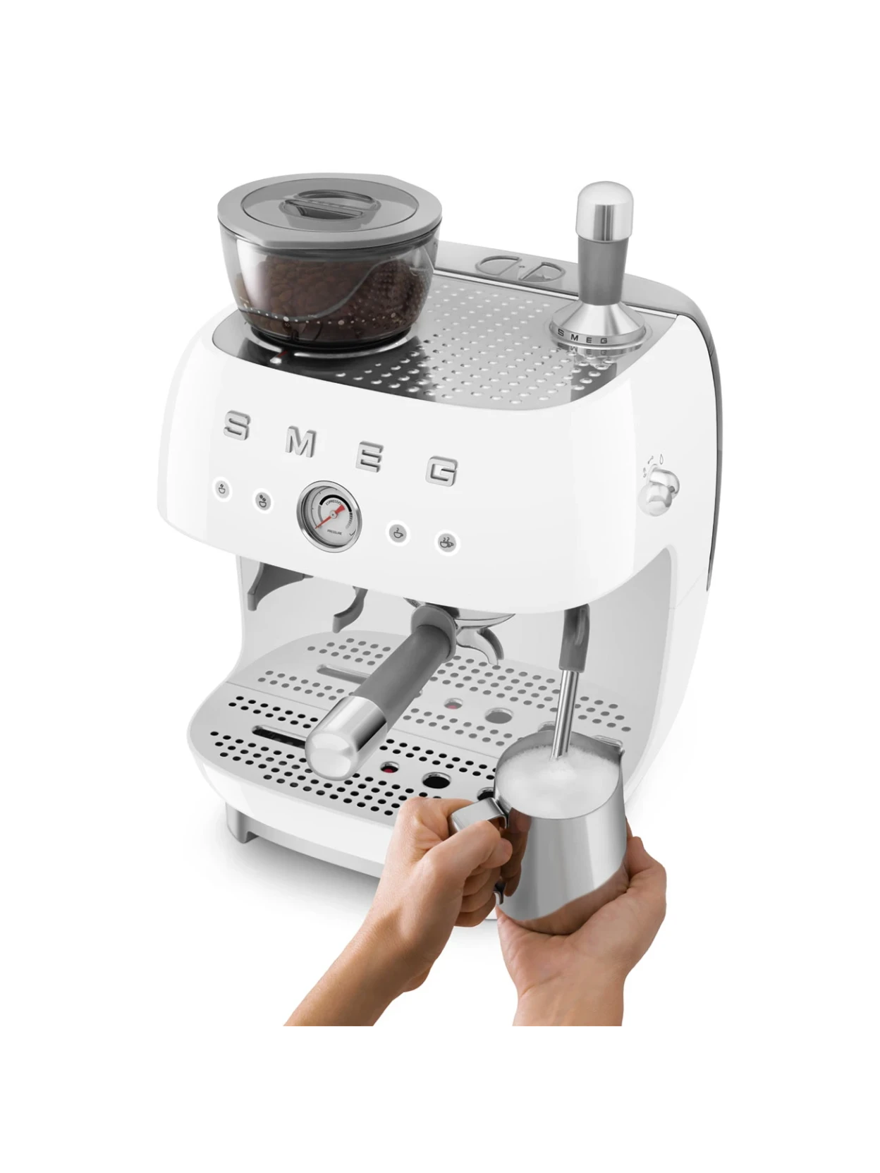 Timeless elegance and professional performance in a single manual espresso machine with a built-in grinder. A 20-bar pump, double Thermoblock, and a 58 mm professional filter holder, all wrapped in Smeg's iconic 1950s design and a refined white finish.