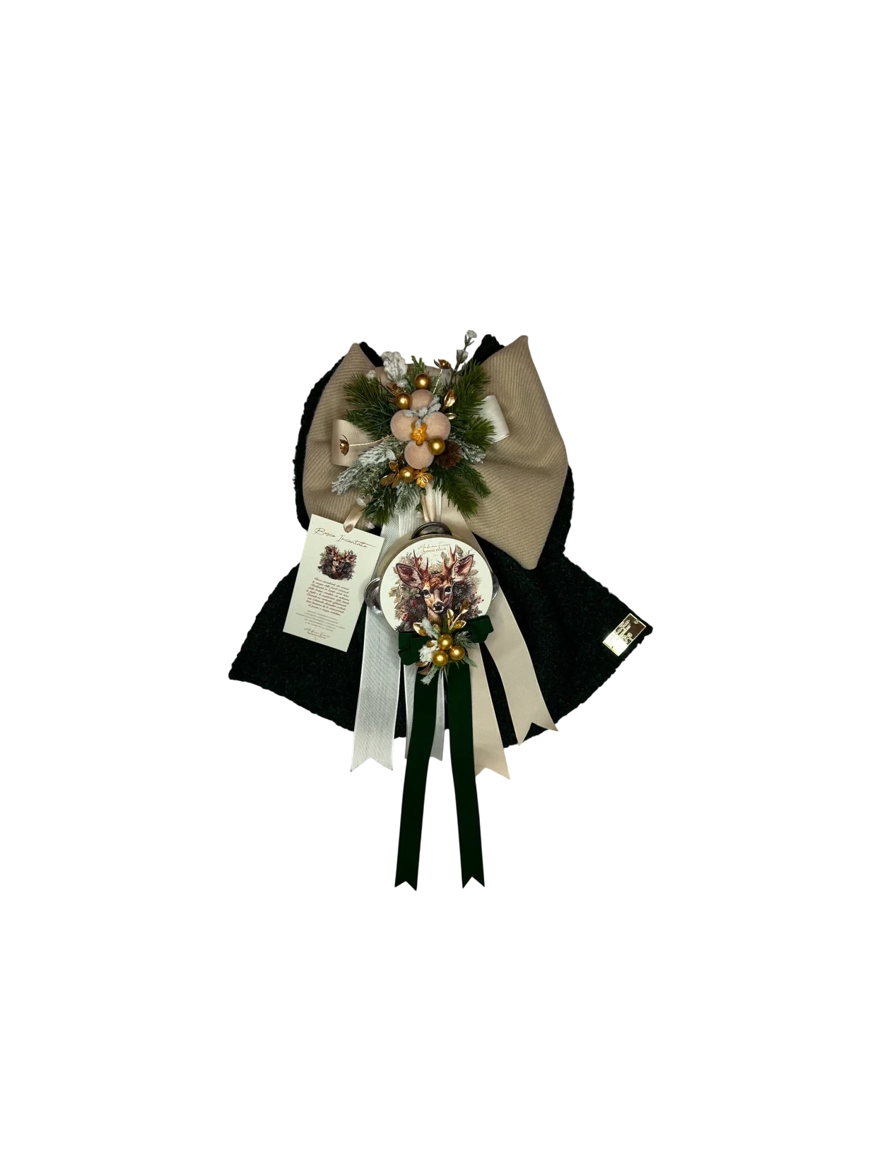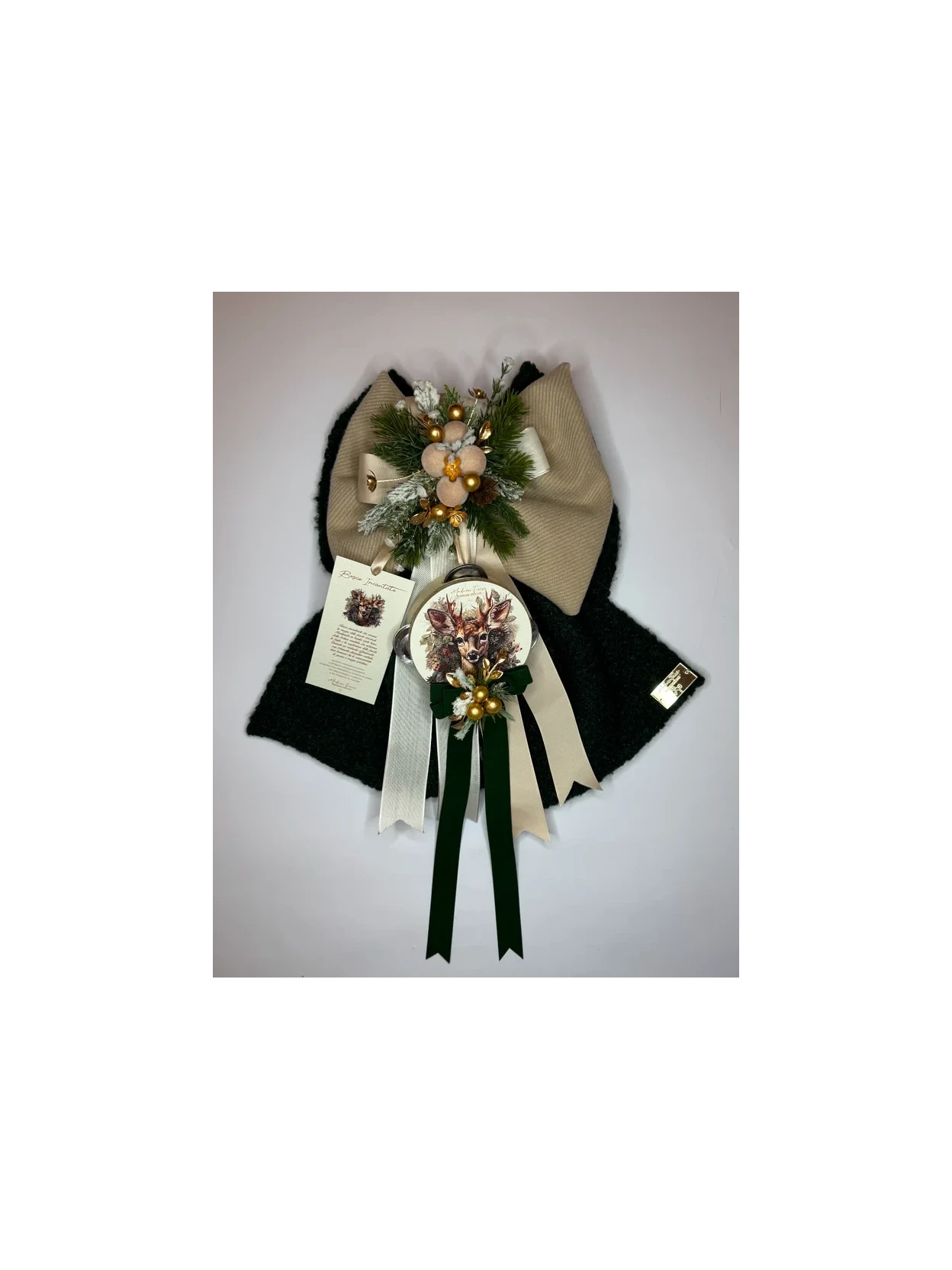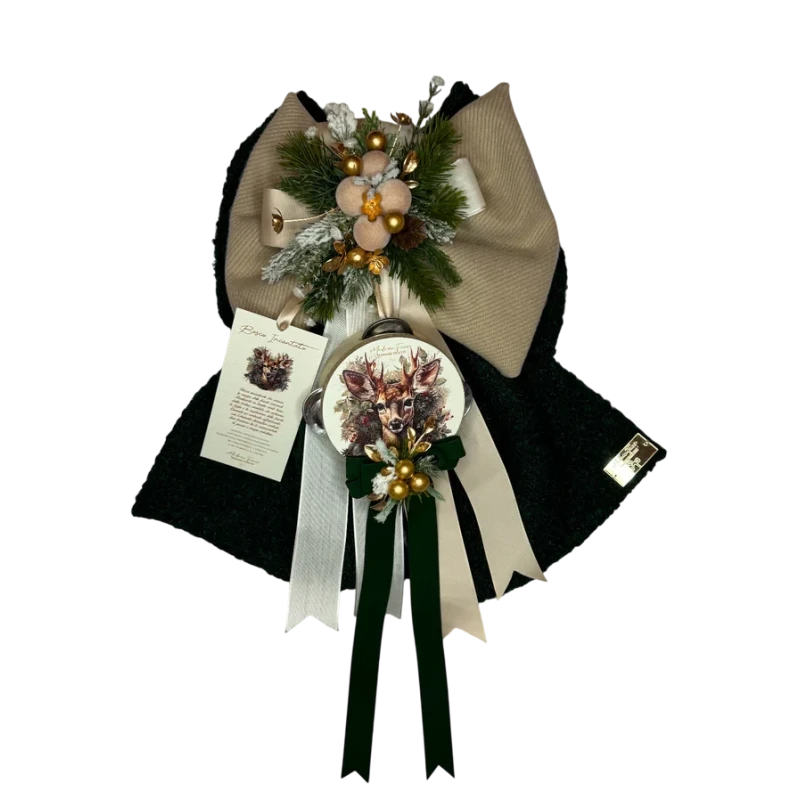 Enter the magic of the holidays with Madame Fioccò's Enchanted Forest Bow, a decoration that evokes the fairytale atmosphere of a snowy forest. Crafted from soft, deep green and beige fabric, it is embellished with elegant ivory ribbons, green branches, pine cones, shimmering gold details, and a tambourine depicting a deer. Standing 40 cm tall, this Christmas bow is ideal as a welcoming door decoration, a refined tree topper, or a dramatic decoration that will make any space unique.