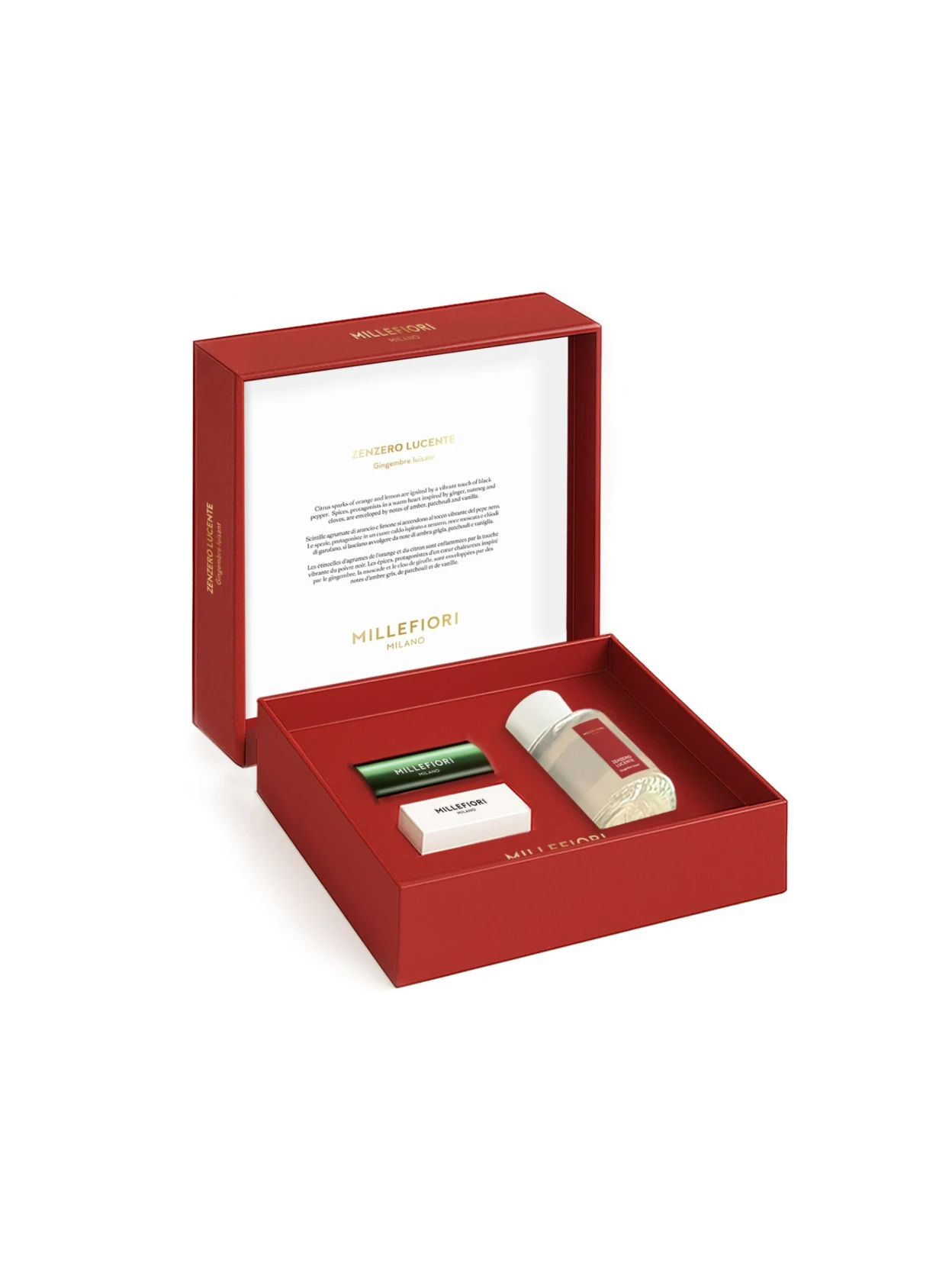 Discover the Bright Ginger Gift Set with a 100ml diffuser and car air freshener. Citrusy sparks of Brazilian orange and lemon intertwine with black pepper, opening a spicy heart of ginger, nutmeg, and cloves. On the base, enveloping notes of ambergris, patchouli, and vanilla add depth and warmth. A woody and spicy fragrance that evokes the luminous anticipation of the holidays: the scent of spices in the air, the pleasure of preparations, and the lively lightness of a shared toast. A gift that transforms any room into a warm, welcoming, and sparkling place.