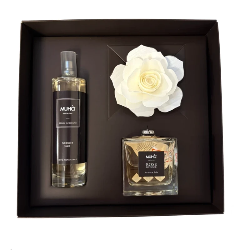 The Muhà Gift Set is a refined scented set consisting of a "Rose" glass room diffuser with a handmade birch wood flower and a room spray in the Acqua e Sale fragrance. A fragrance inspired by the sea breeze, where the freshness of ozone, anise, and salt intertwine with delicate notes of geranium, orchid, and hawthorn, creating a balance between air and sea. The warm essences of hay, vanilla, blond tobacco, and musk emerge from the base, creating an enveloping and sensual scent. Directions for use: Insert the flower into the bottle and, using the included pipette, distribute the scented liquid over the petals. The more essence you apply, the more intense the fragrance will be. Position the diffuser at eye level, preferably in the center of the room, to promote even diffusion of the fragrance.