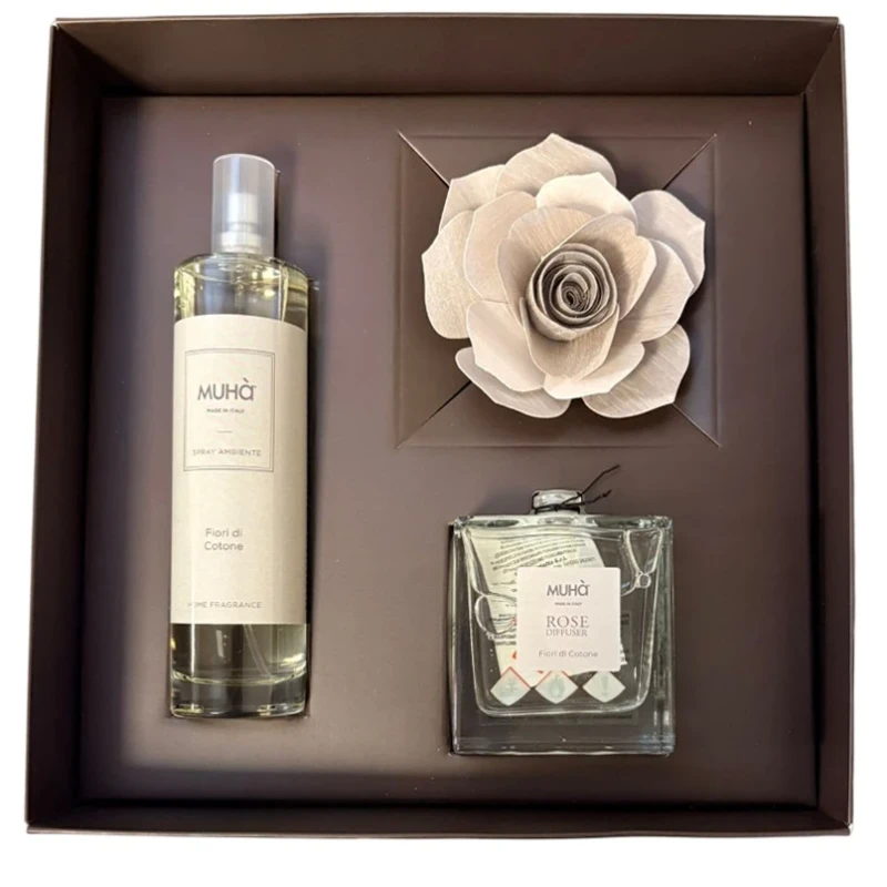 The Muhà "Rose" Gift Set embodies elegance and harmony in a carefully crafted scented set. It contains a 100 ml room diffuser with a handcrafted birch wood rose and a 100 ml room spray, both in the Cotton Flowers fragrance, a symbol of purity and comfort. The fragrance opens with fresh notes of bergamot and ozonic accents, evoking the cleanliness and lightness of laundry hanging out to dry in the sun. The floral heart notes include jasmine, lily of the valley, violet, orange blossom, ylang-ylang, and rose, creating a delicate and refined bouquet. The base notes of musk, tonka bean, amber vanilla, and sandalwood add depth and warmth, enveloping the room in a soft and relaxing embrace.