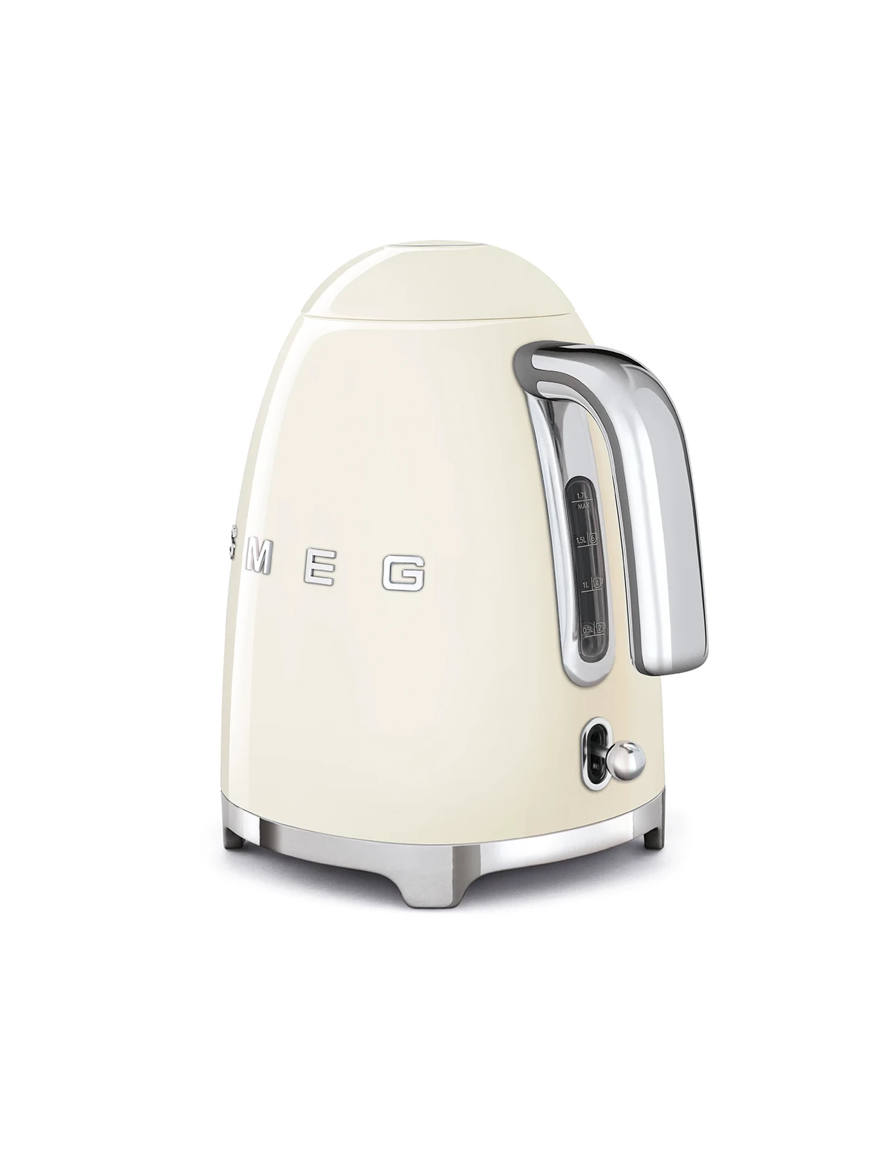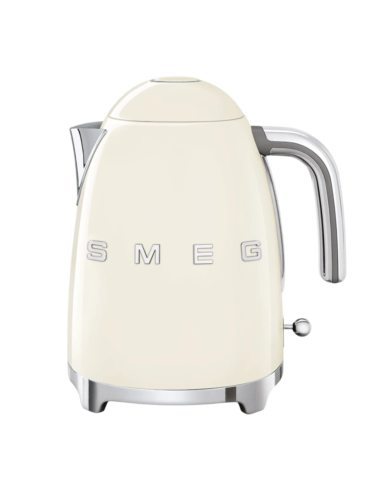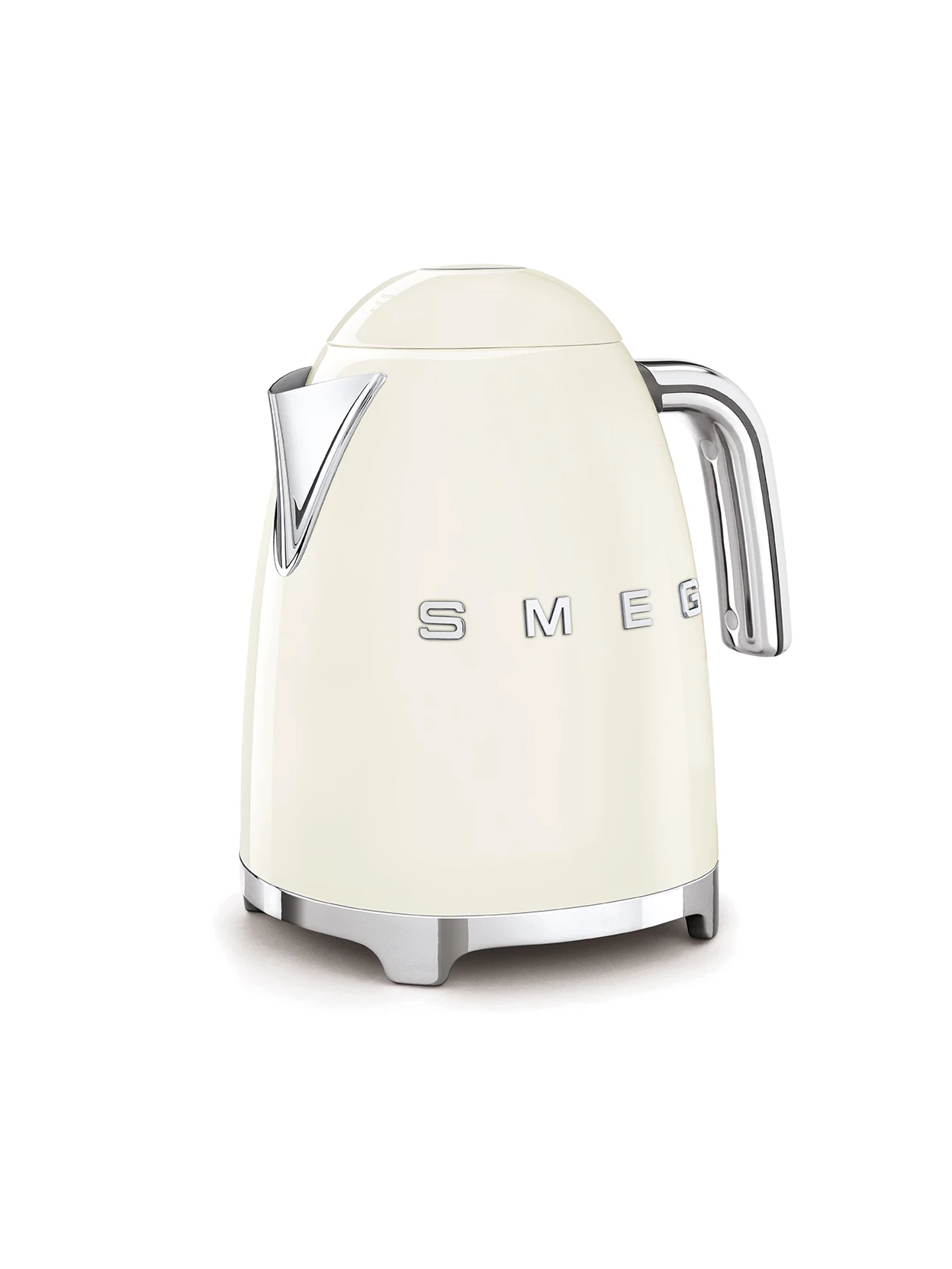 The Smeg 1.7-liter, glossy cream electric kettle combines high performance and iconic design to easily prepare any hot drink. The soft-opening lid, 360° swivel base, and automatic shut-off ensure convenience, safety, and elegant style in the kitchen.