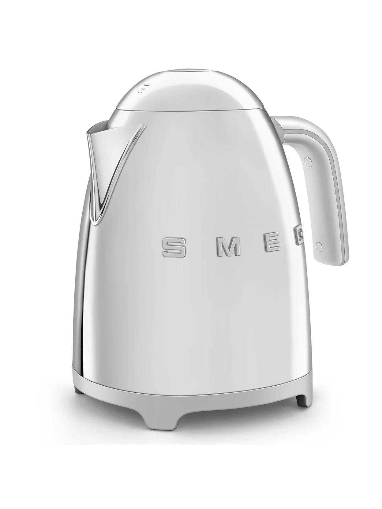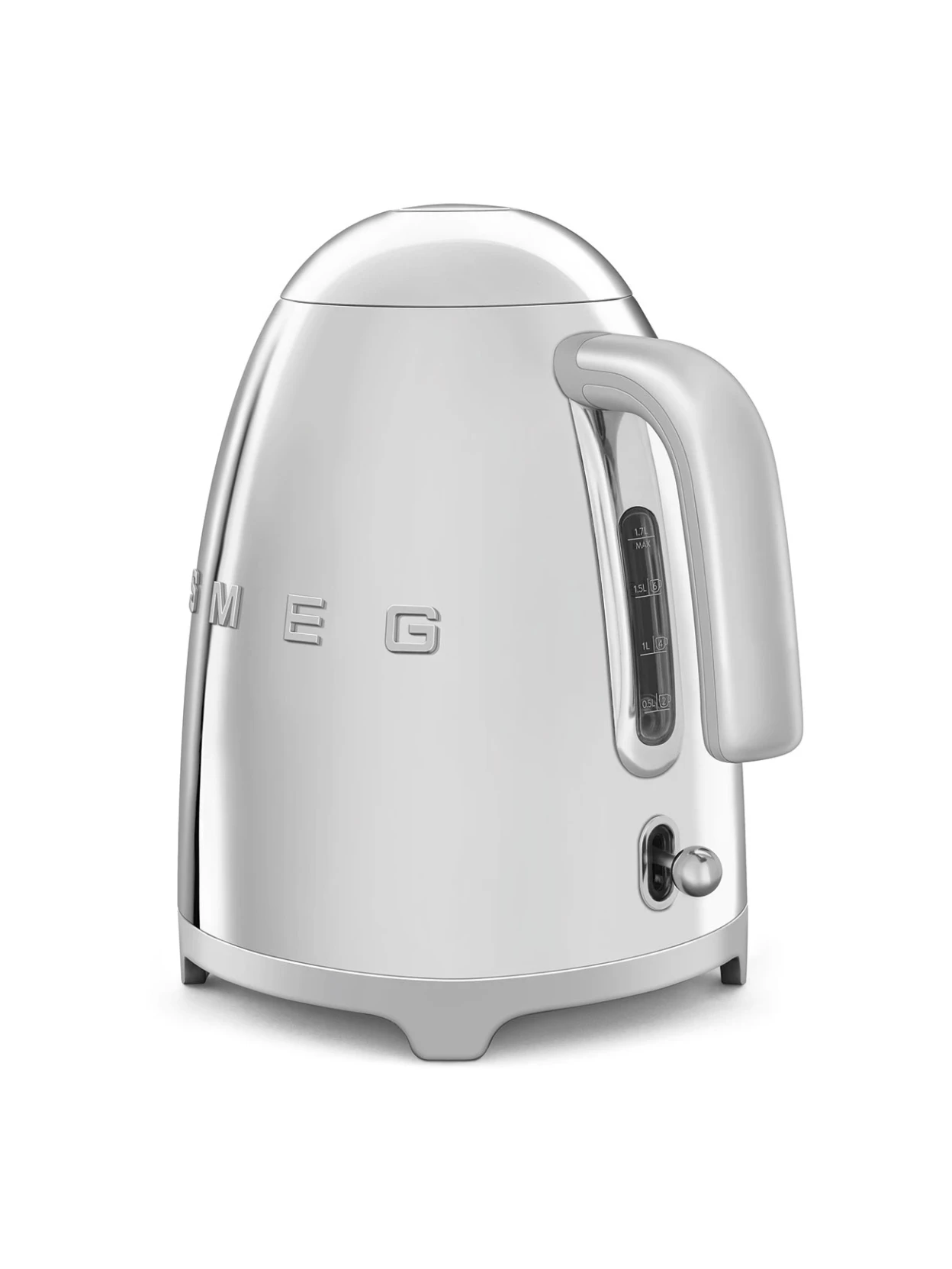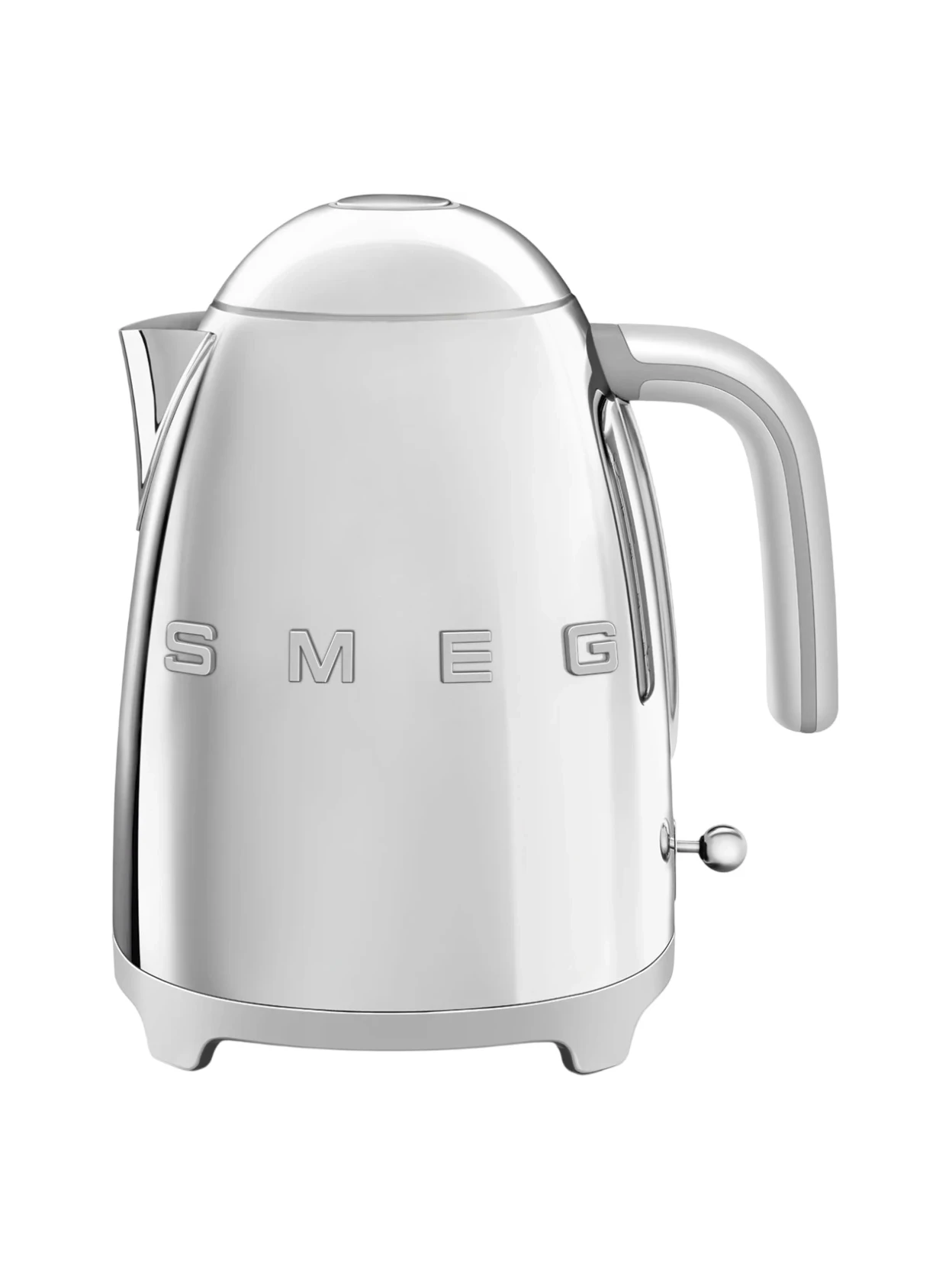 Smeg electric kettle in polished stainless steel, with an iconic 1950s design. 1.7-liter capacity (up to 7 cups), soft-opening spout, 360° swivel base, and 100°C auto-off. Timeless elegance and reliable performance for every kitchen.