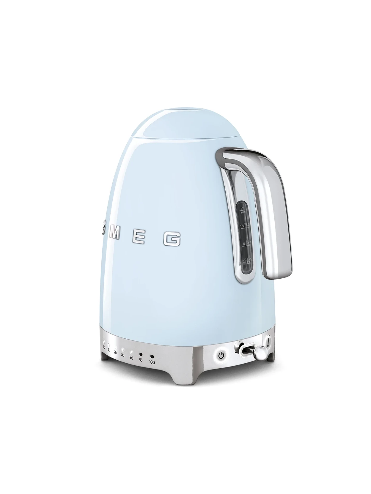 Smeg electric kettle in glossy blue, with 7 selectable temperature levels (50–100°C) and a Keep Warm function for up to 20 minutes. 1.7-liter capacity (up to 7 cups), soft opening, 360° swivel base, and automatic shut-off. 1950s style and precise performance for every hot beverage.