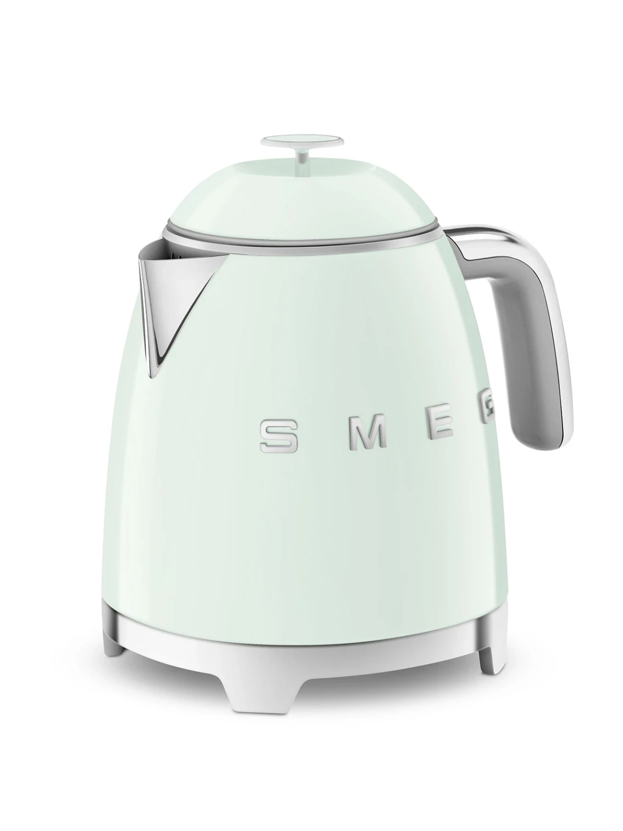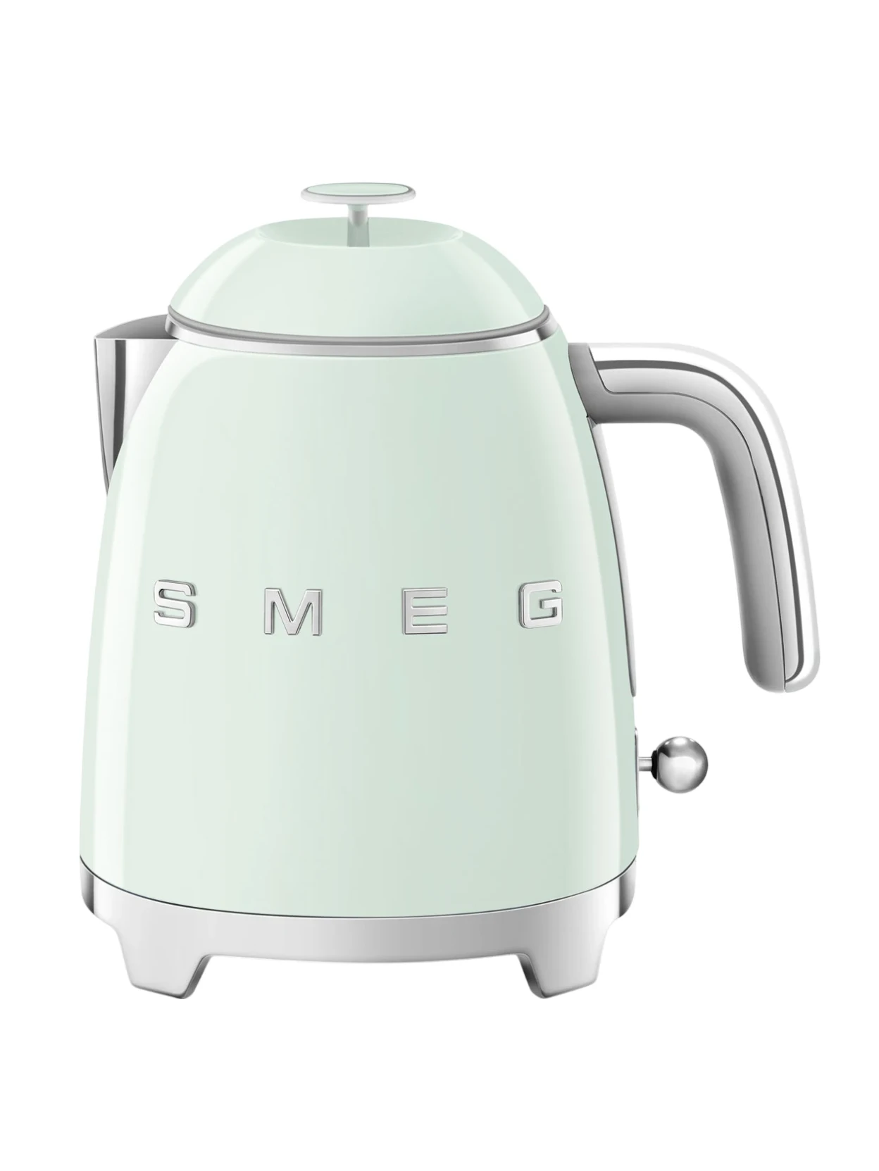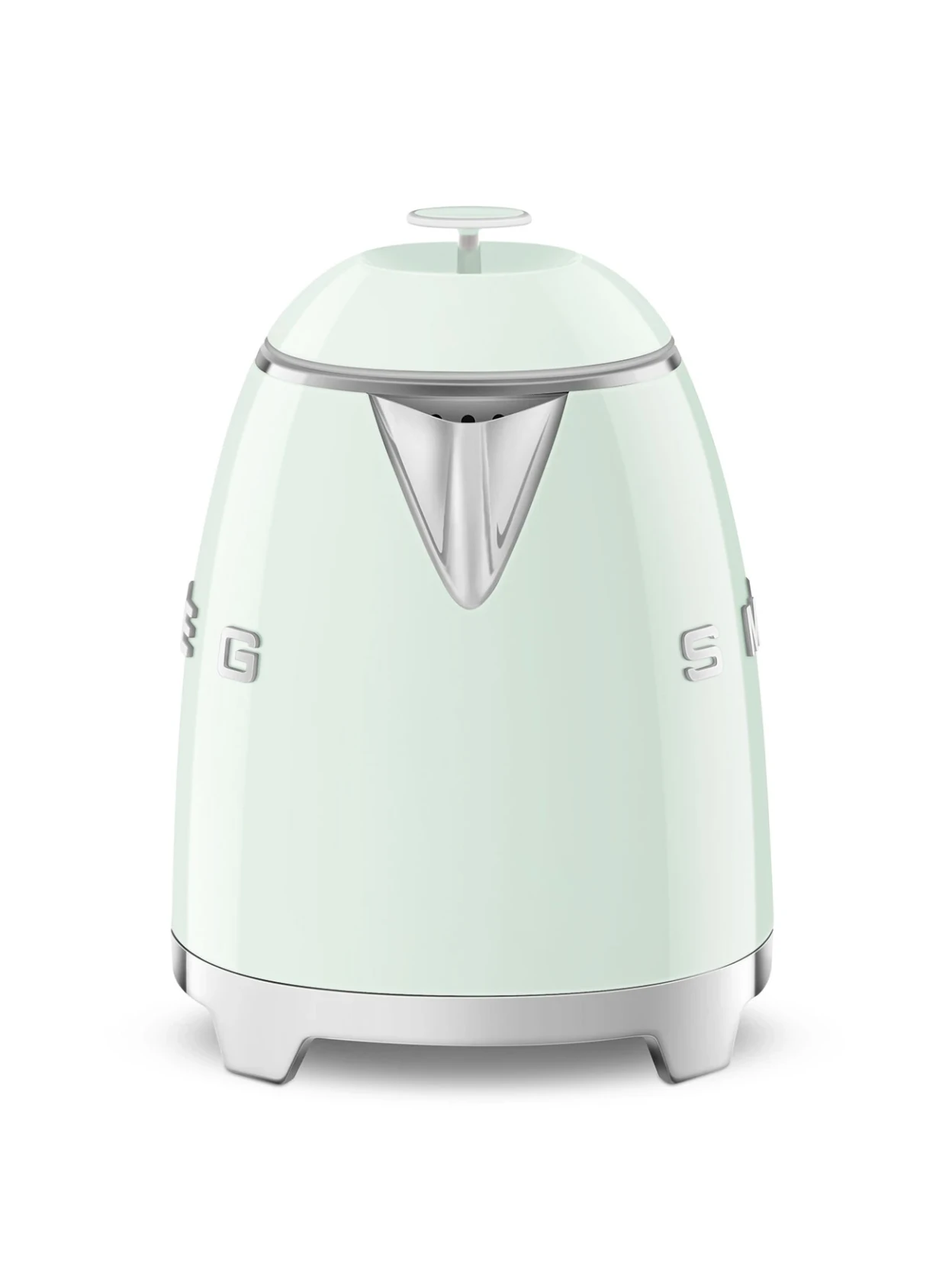 The Smeg Glossy Pastel Green 50's Style mini electric kettle combines iconic design, practicality, and a delicate color. With a 0.8-liter (3-cup) capacity and 1400W of power, it's perfect for small spaces like home offices, living rooms, or hotel rooms, reducing water and energy waste.