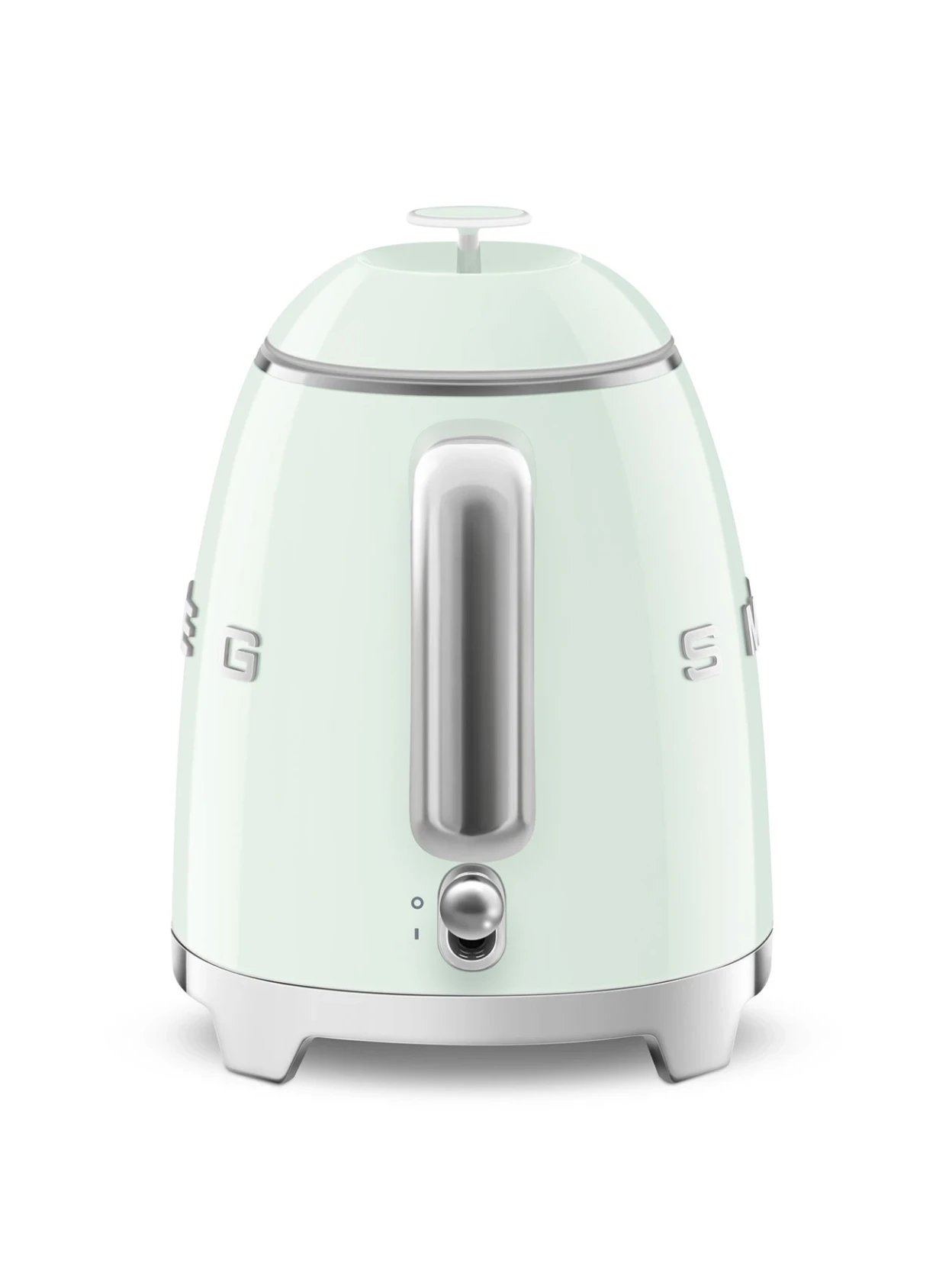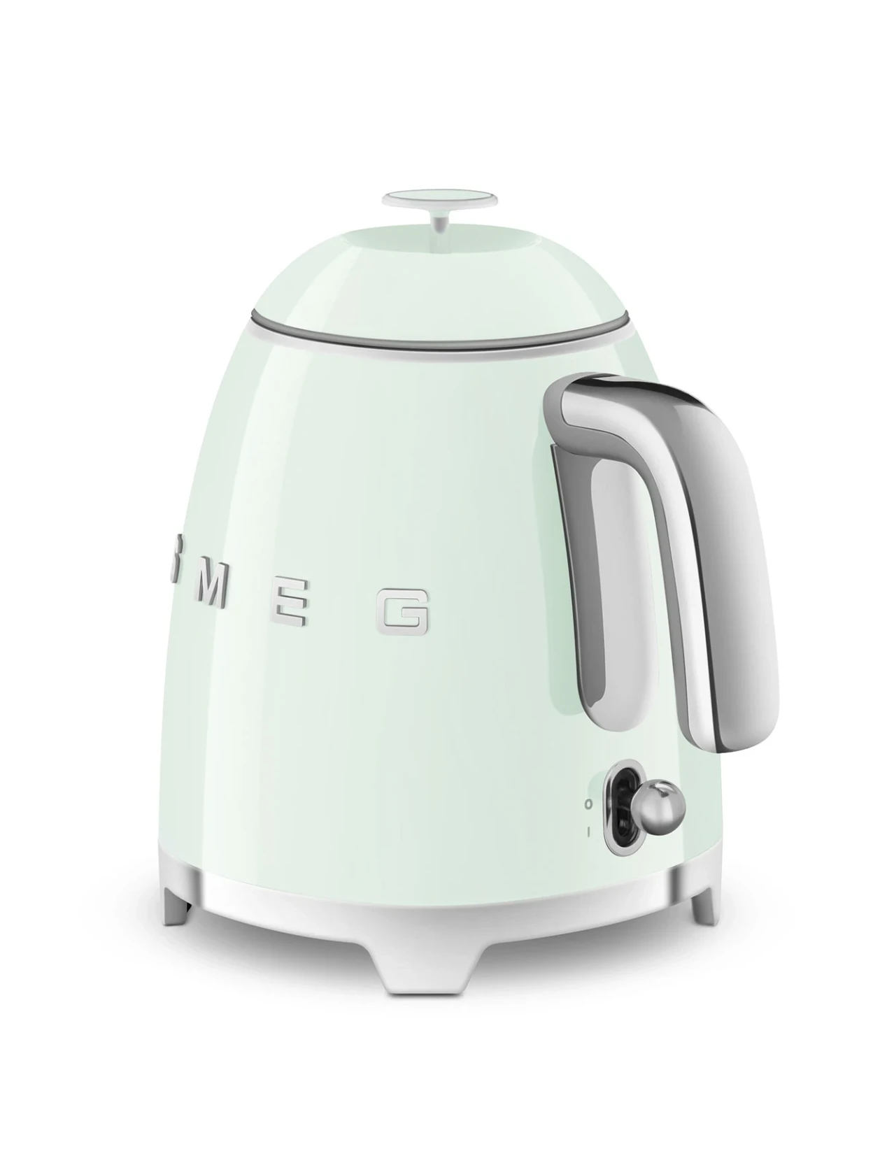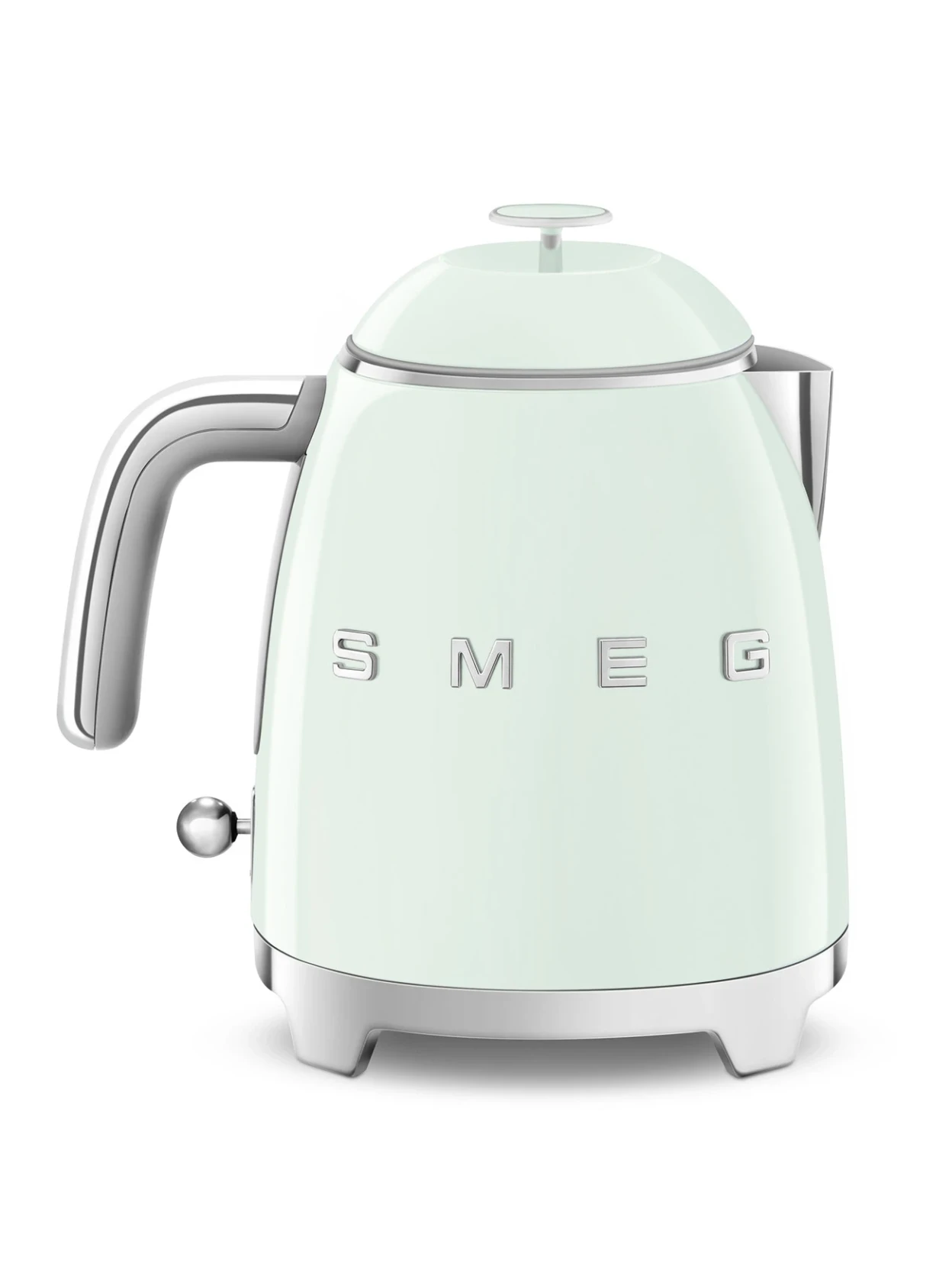 The Smeg Glossy Pastel Green 50's Style mini electric kettle combines iconic design, practicality, and a delicate color. With a 0.8-liter (3-cup) capacity and 1400W of power, it's perfect for small spaces like home offices, living rooms, or hotel rooms, reducing water and energy waste.