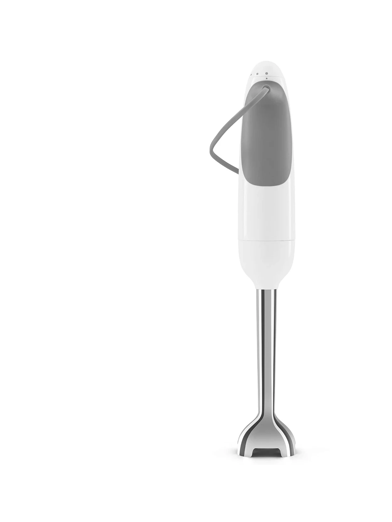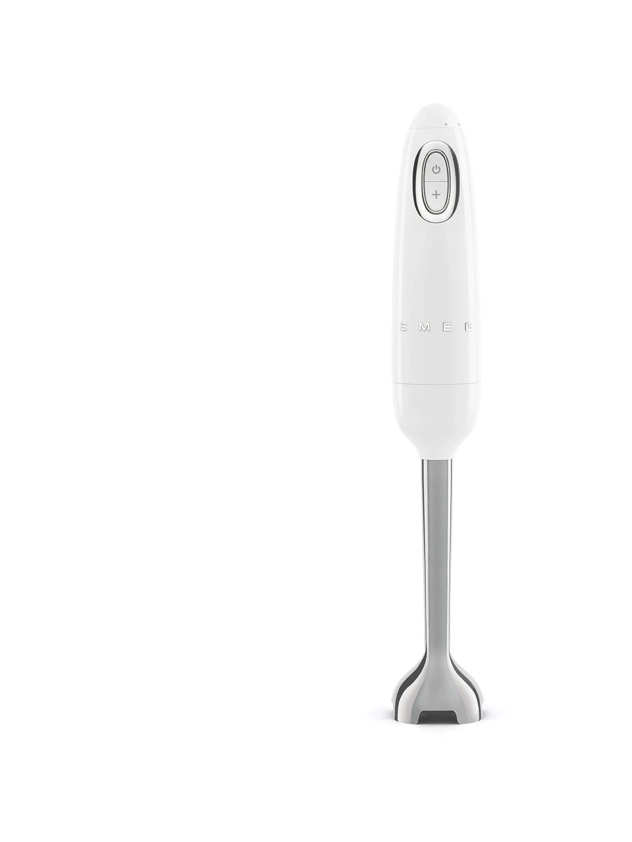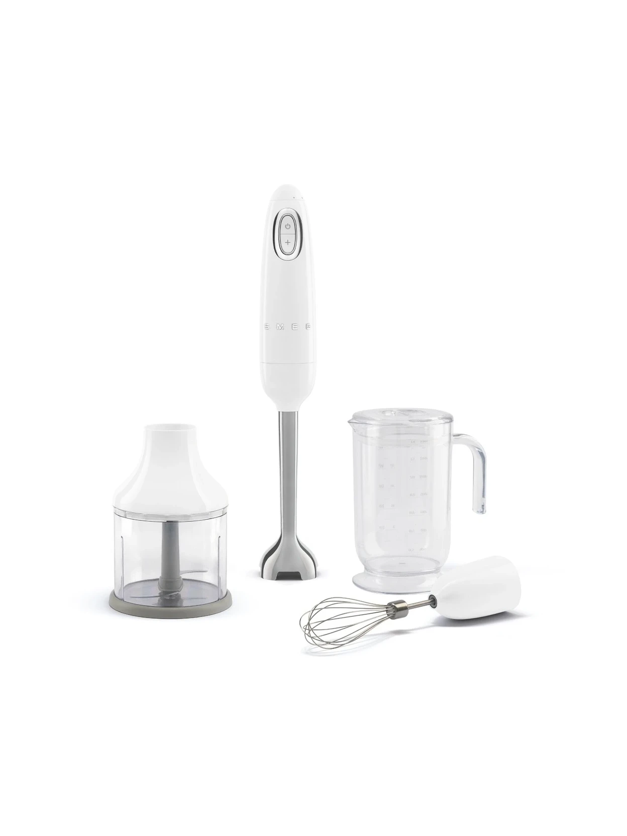 The white Smeg hand blender with included accessories is powerful, versatile, and ready to satisfy every kitchen need. The 700W motor, variable speed, and turbo function allow for complete control over the final result, while the stainless steel blades with FlowBlend system ensure perfectly smooth ingredients. The included measuring jug, chopper, and wire whisk make this complete set ideal for quick and precise daily preparations.