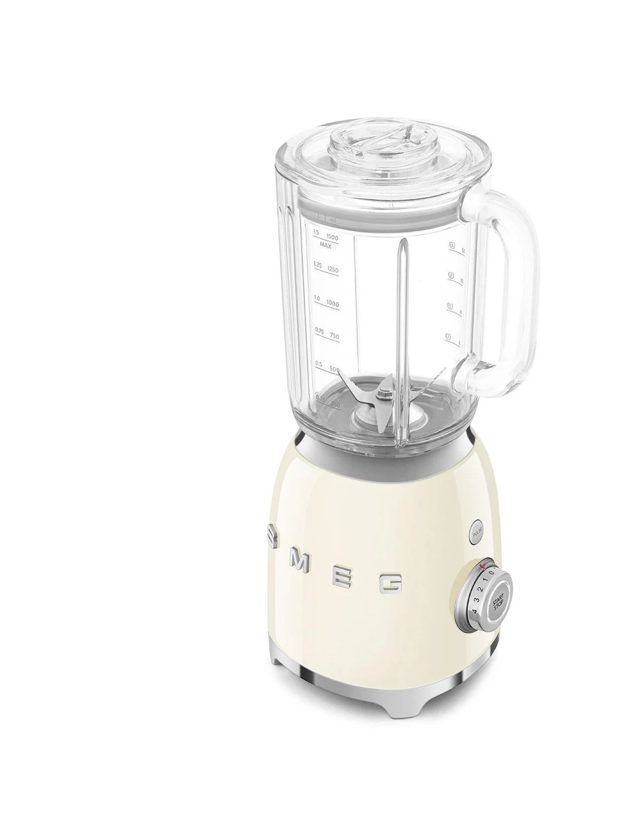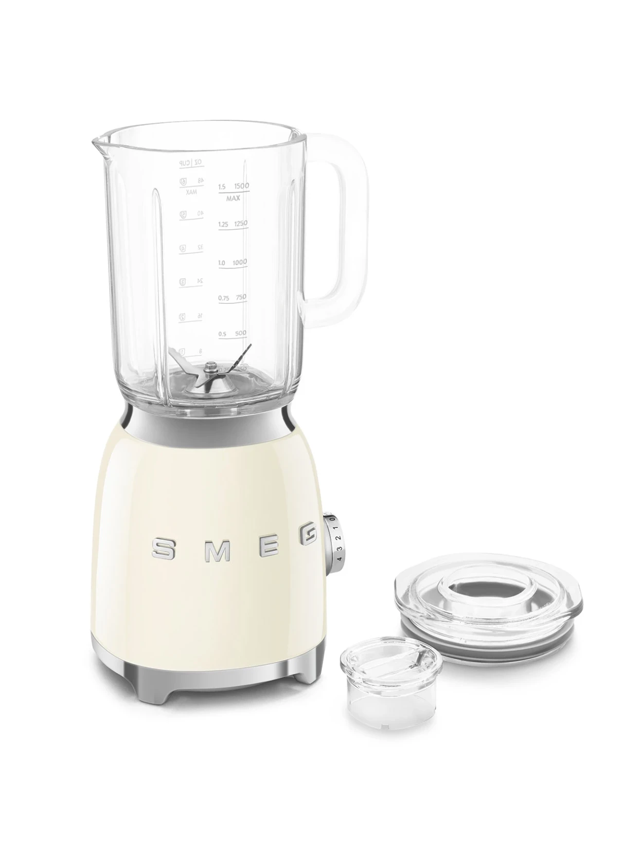Smeg Cream 50's Style Blender: timeless elegance and high performance. 800W motor, 4 speeds, Smoothie, Green Smoothie, and Ice Crusher programs for perfect results every day. 1.5L jug, stainless steel blades, and Auto Clean function for quick cleaning.