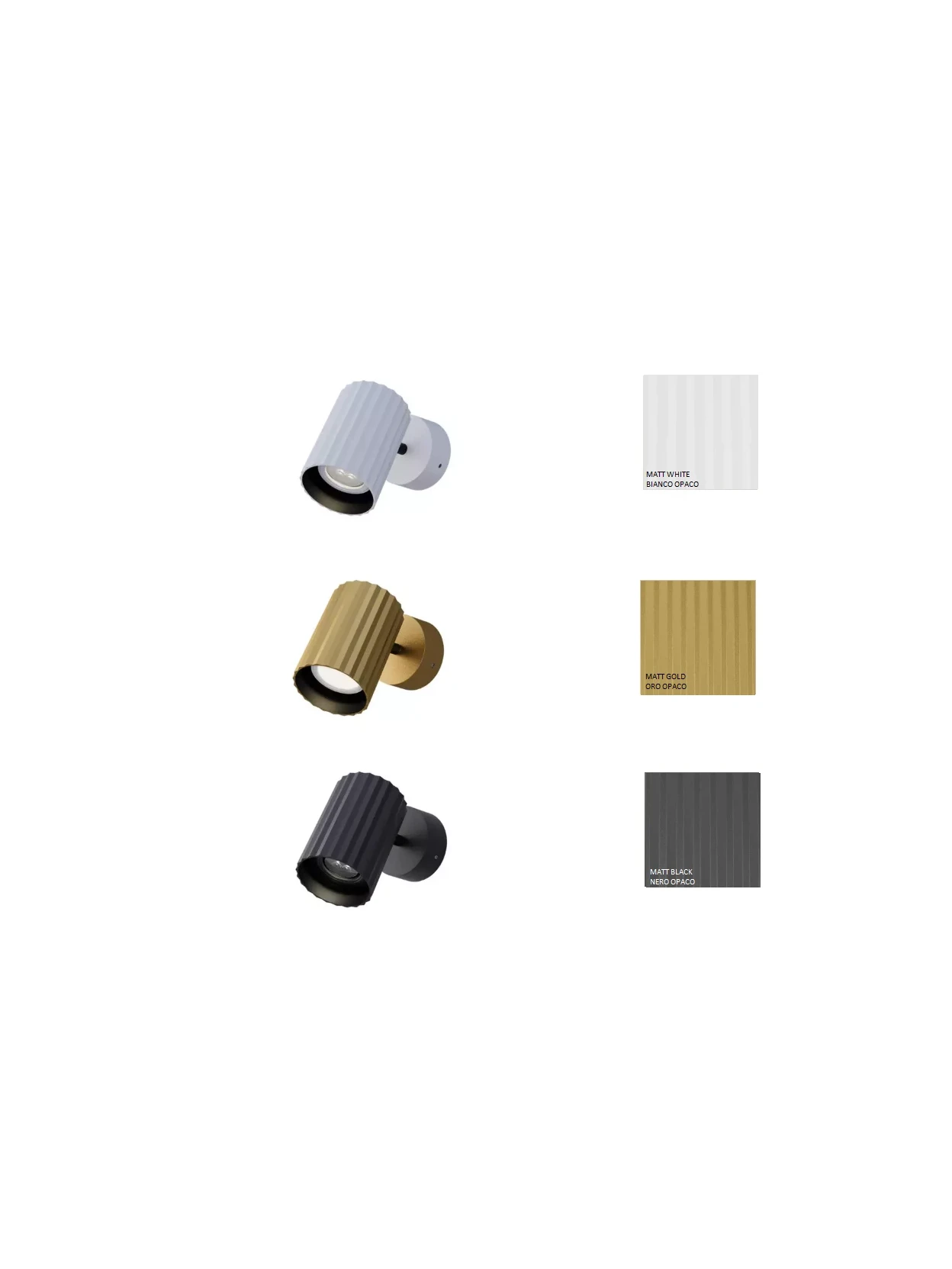 Delphi by Redo Group is an adjustable mini projector; the ideal choice for targeted and stylish lighting. Designed for ceiling or wall installation, it houses a PAR16 LED bulb with a GU10 socket (max 7W). The extruded aluminum frame is powder-coated in white, black, or matte gold on the outside, with a contrasting matte black interior. Powered by 220–240V, 50/60Hz, it has an IP20 rating and protection class I.