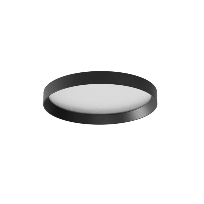 LED ceiling lamp with die-cast aluminum and powder-coated metal structure in a matt black finish and a microprismatic polycarbonate diffuser.