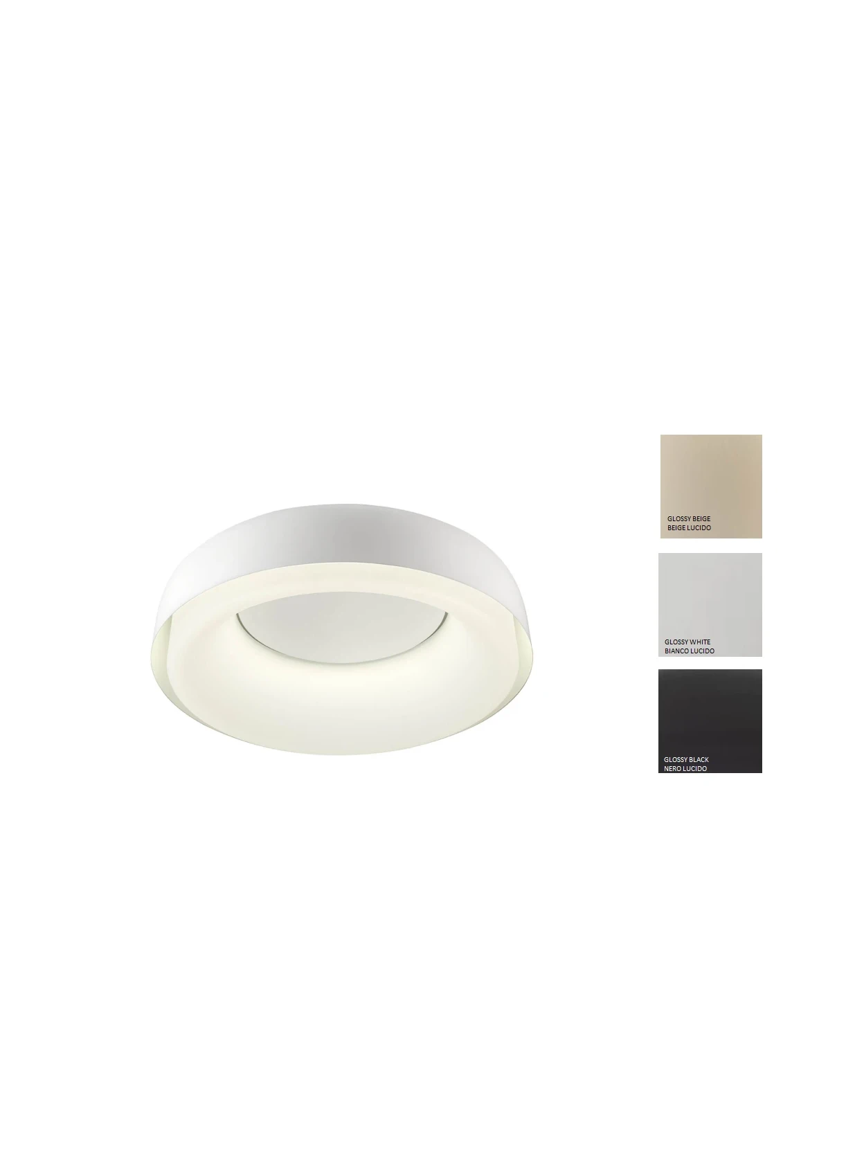 LED ceiling lamp with metal structure painted in a glossy white finish and opal white polypropylene diffuser.