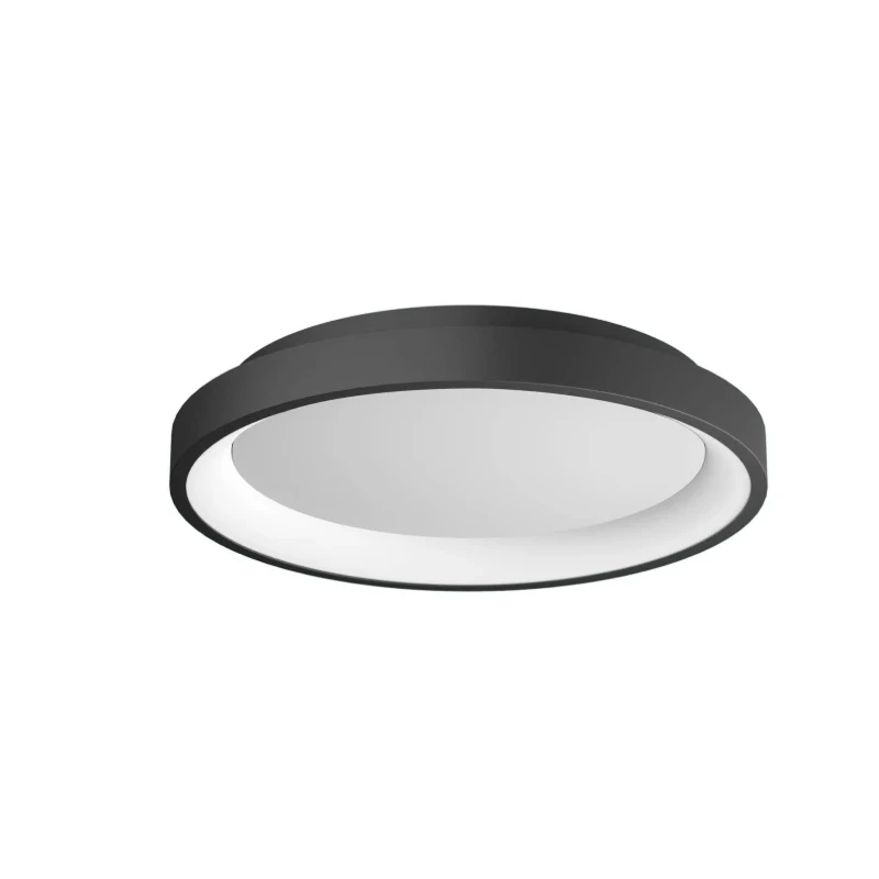 Iconic by Redo Group is a modern interior LED ceiling lamp featuring a 3-step dimmer and adjustable color temperature from warm white (3000K) to neutral white (4000K). Its metal and aluminum frame is painted matte black, with a white opal acrylic diffuser for a soft, even light. High-efficiency SMD LEDs with a CRI of 90. Class II, IP20 – Power supply 220–240V, 50/60Hz.