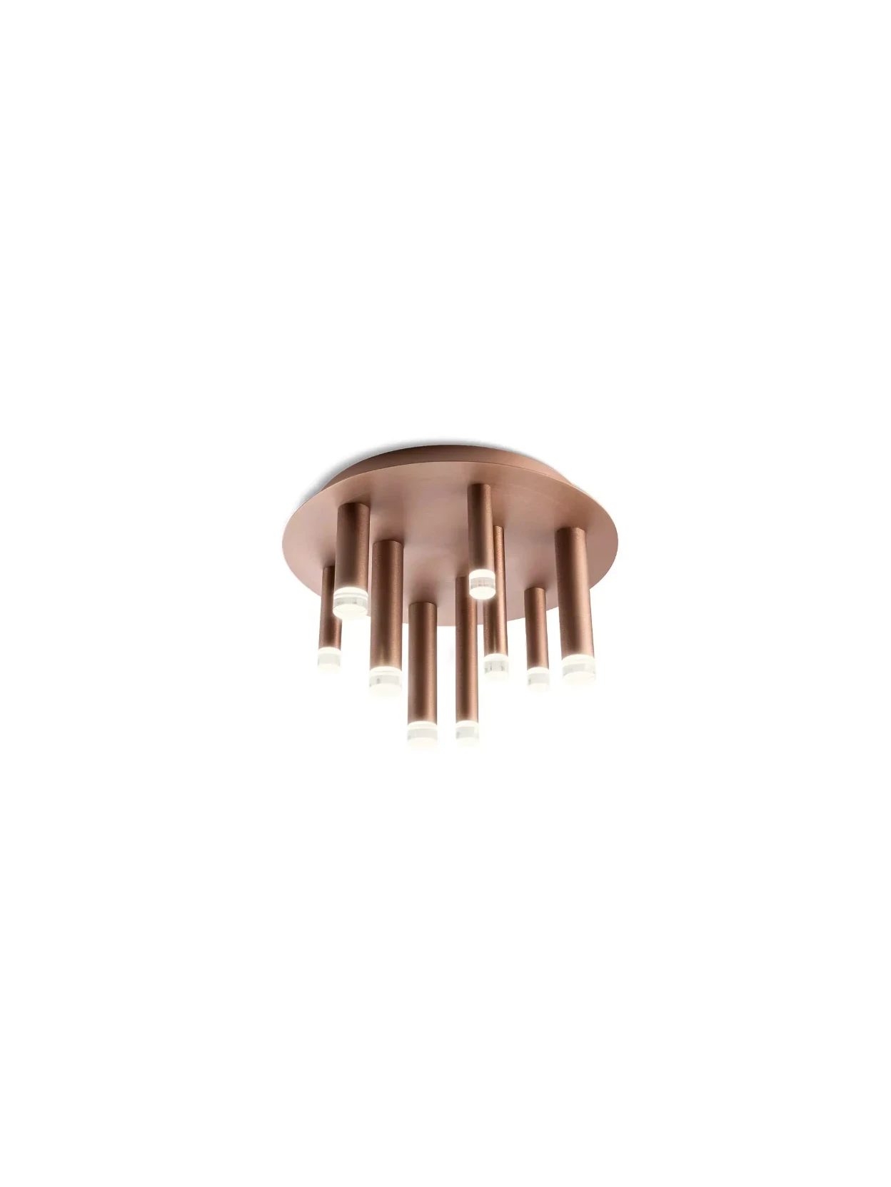 LED ceiling lamp made of metal and brushed aluminum anodized matt copper and transparent acrylic diffusers.