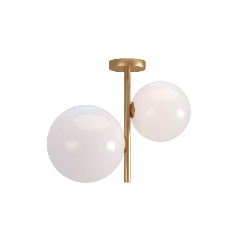 Talis by Redo Group is a ceiling lamp with a minimalist and modern design. With its brushed bronze-finish metal frame and opal white blown glass diffusers, this ceiling light brings a timeless elegance to interiors. The meticulous craftsmanship and the contrast between the warm bronze hue and the purity of the glass create a perfect balance between classic and contemporary style. Designed for two E27 bulbs up to 42W each, it allows you to freely choose the intensity and tone of the light, adapting to different times of day and desired atmospheres. It fits naturally into living rooms, bedrooms, dining rooms, or entryways, becoming a decorative element as well as a source of illumination.
