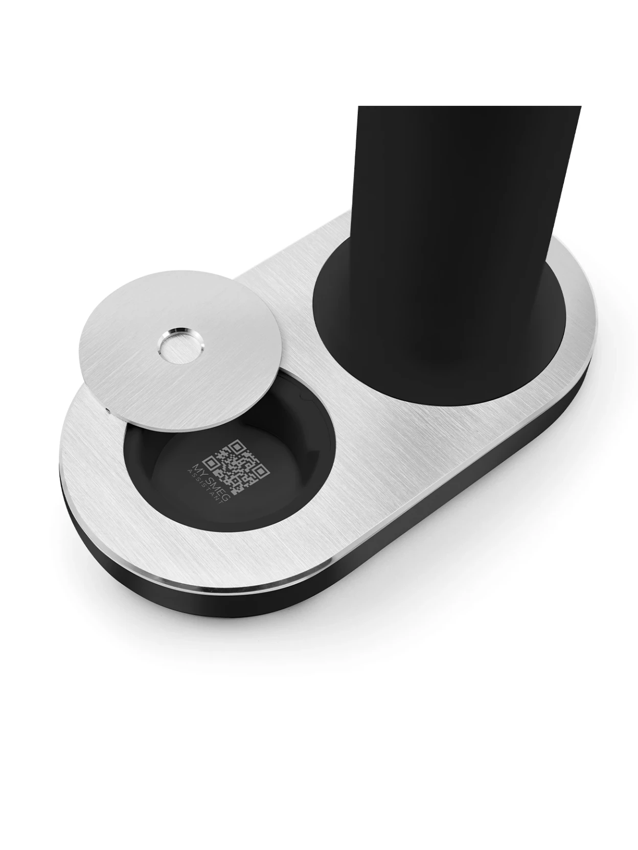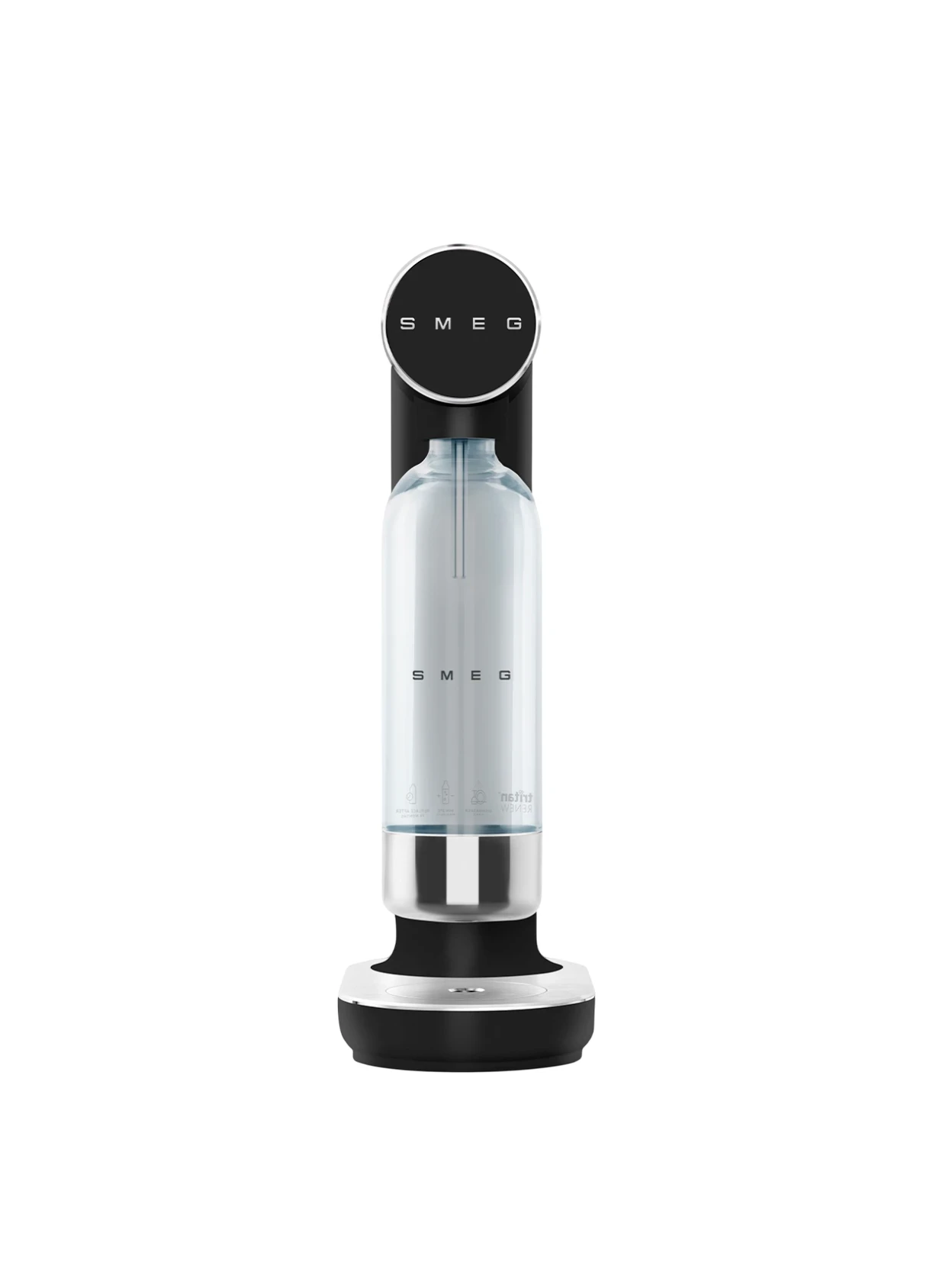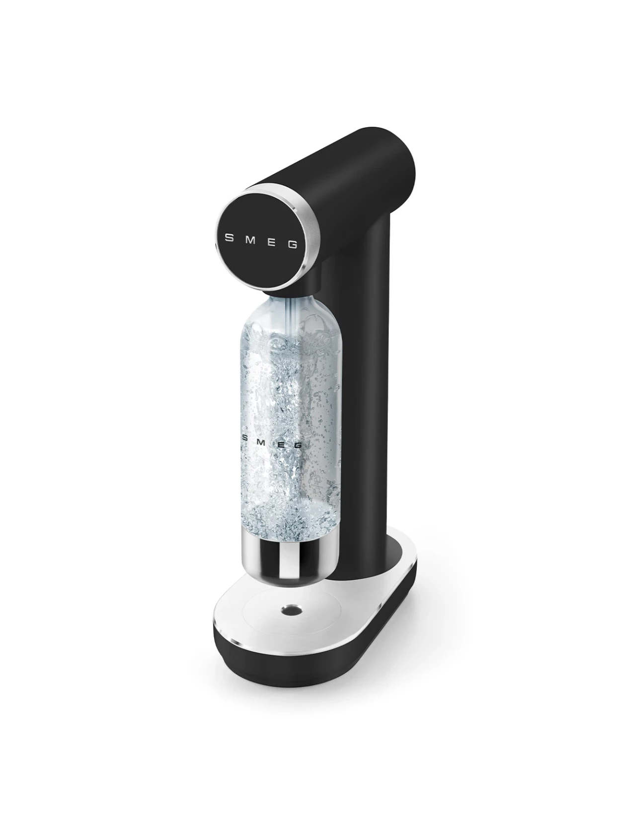 The black Smeg Collezione water carbonator transforms tap water into a customizable sparkling beverage. Featuring an intuitive knob to adjust the CO₂ level and a dishwasher-safe Tritan™ Renew bottle, it combines elegance, practicality, and sustainability in a compact and refined design.