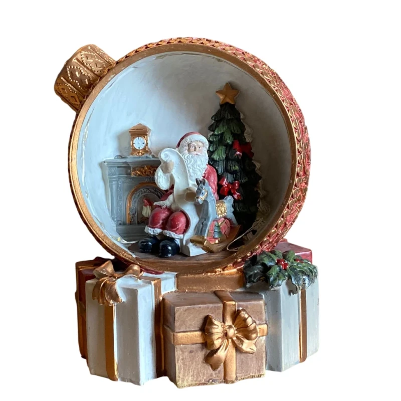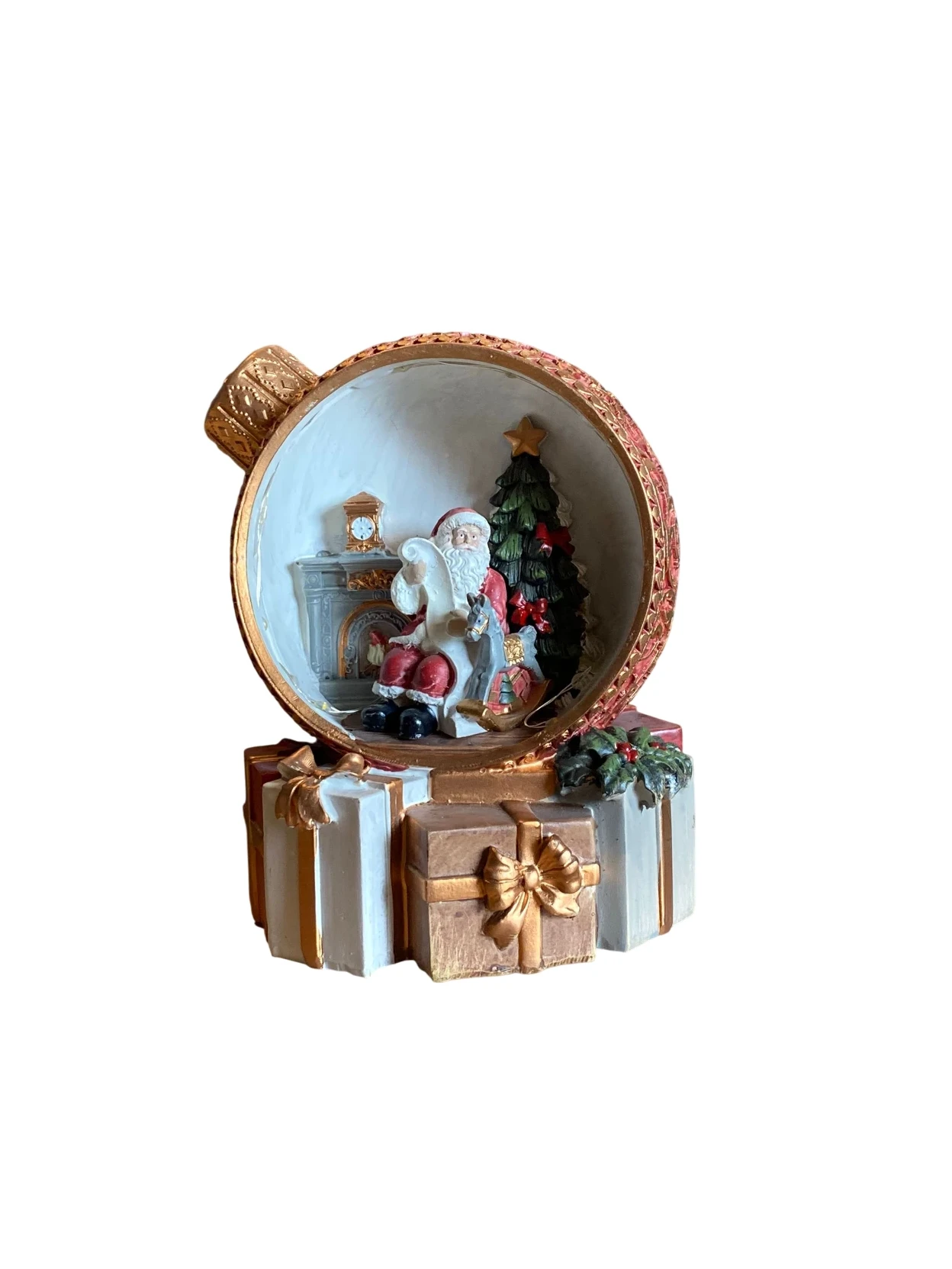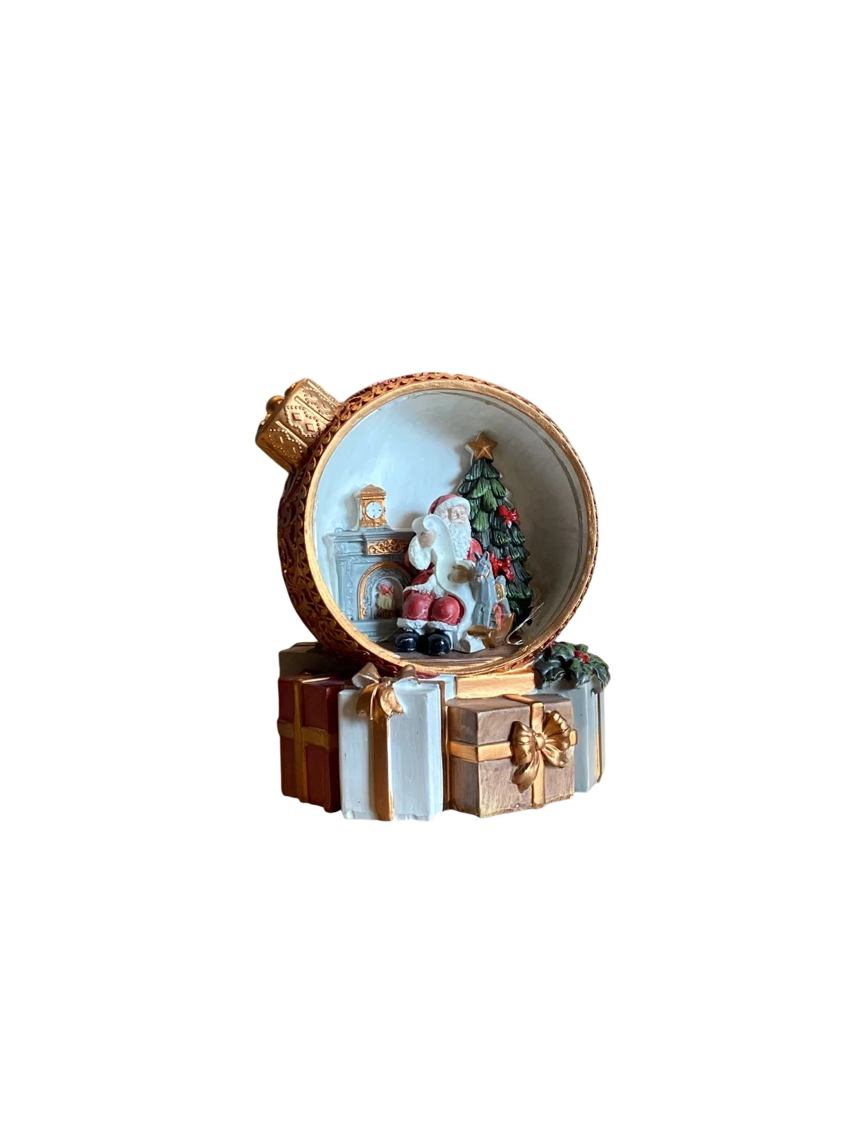 Elegant illuminated Christmas bauble by Henriette from the Prestige X'Mas collection. Inside, Santa Claus with his children's list, surrounded by gifts. Magic and Christmas atmosphere in a single decoration.