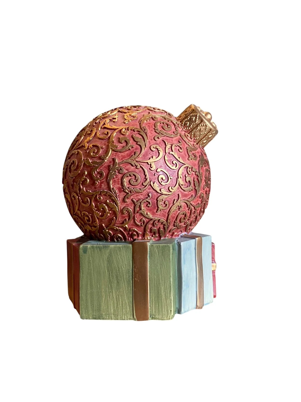 Create an enchanting atmosphere with the Illuminated Christmas Sphere Ornament from Henriette's Prestige X'Mas collection. This refined illuminated sphere depicts Santa Claus with his list of good children, sitting atop a pile of Christmas presents. The warm internal lights enhance the details and cast a festive glow that makes any room unique.