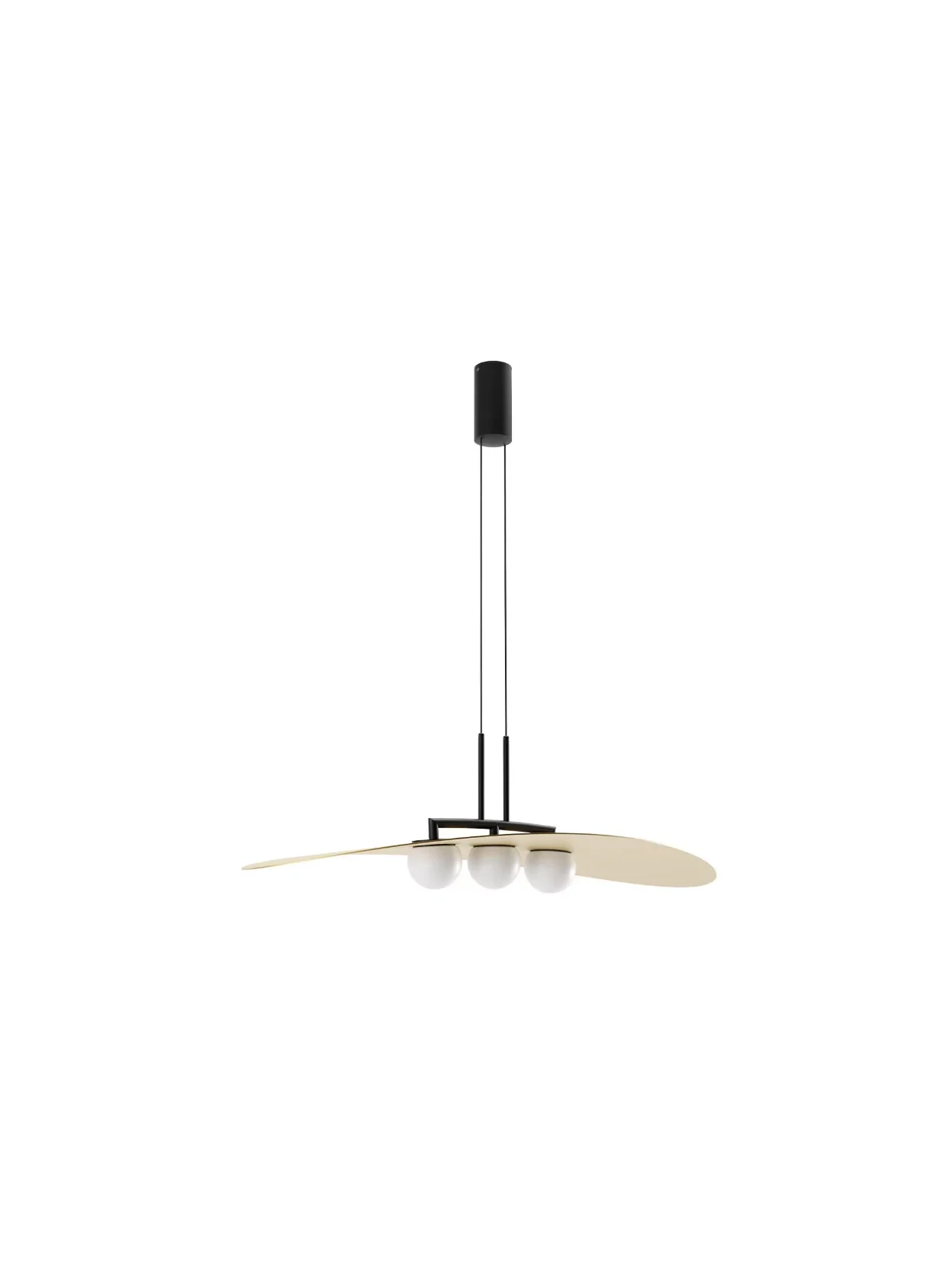 LED pendant lamp in metal with black and matt gold finish and 3 opal blown glass diffusers.