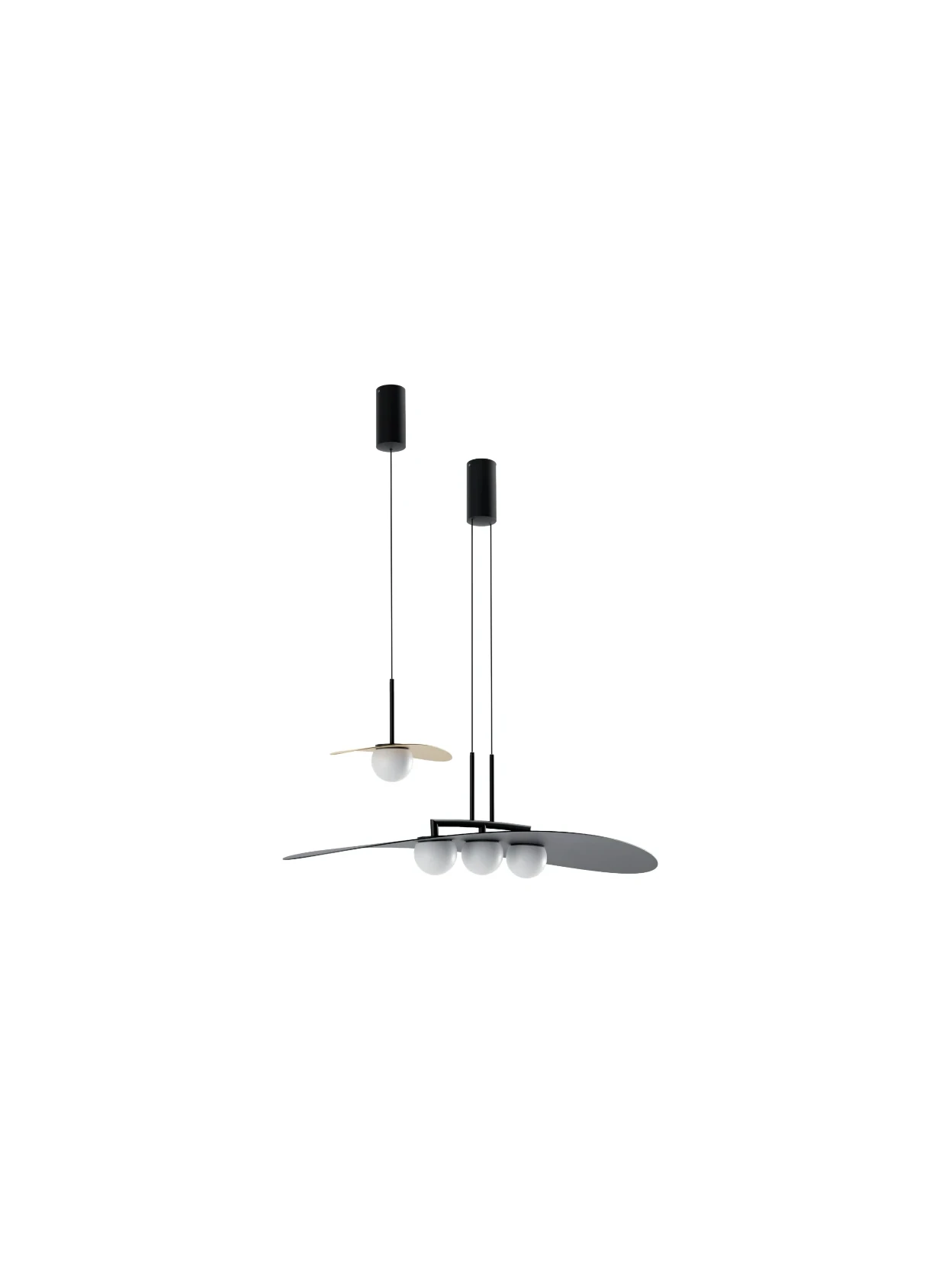 Cody by Redo Group is an indoor pendant lamp with a triple light source, perfect for environments that require a stage presence and effective lighting. Matt black powder-coated metal structure, matt gold aluminum lampshade and opal blown glass diffusers, for a warm, soft light with great visual impact. Equipped with 3 9W CREE COB LEDs, color temperature 3000K, total luminous flux 2700 lm (system: 1600 lm), CRI 90. Not dimmable. Perfect for dining tables, living areas or contract environments with a strong and modern style.