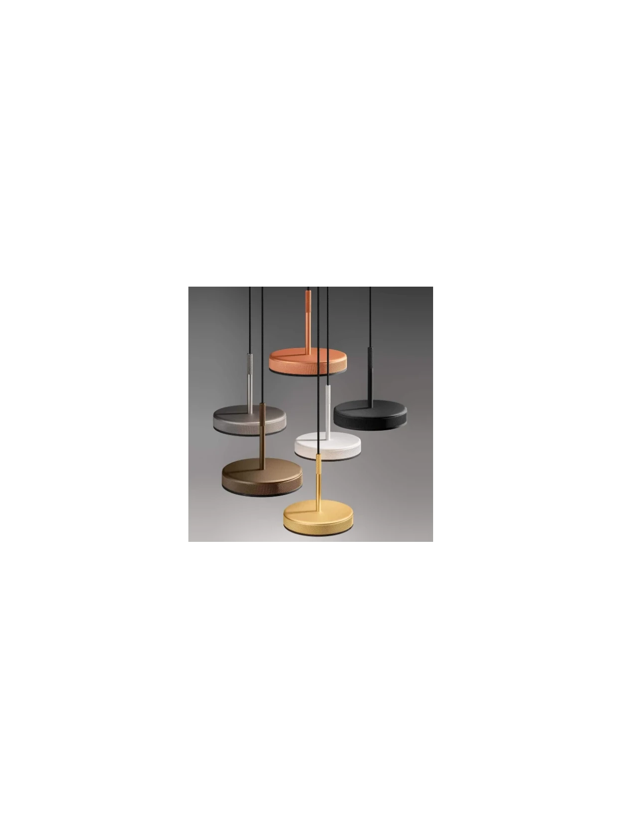 Overfly in Titanium finish by Olev projects a bold and precise beam of light downwards, ideal for illuminating tables, counters, and living areas. The optional anti-glare honeycomb filter creates a softer atmosphere without sacrificing light quality. The crossed knurling detail characterizes the perimeter of the lower disk, generating geometric patterns and delicate reflections, while the same detail is repeated on the upper cylinder, available in a tone-on-tone or contrasting version. Crafted with OLEV's handcrafted paints, Overfly Titanium combines visual lightness, elegance, and high-quality materials, becoming a designer pendant lamp perfect for modern, refined, and distinctive spaces.