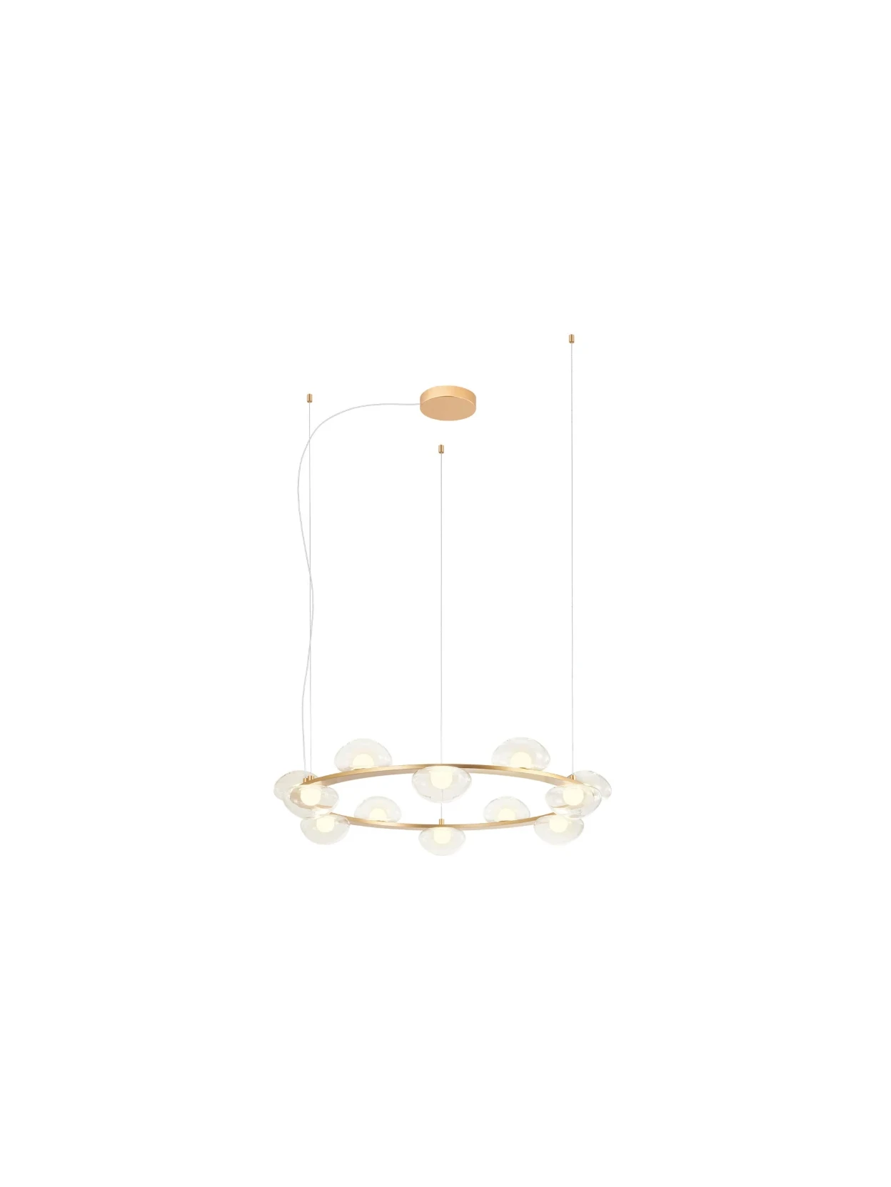 Sinclair Circolare is a refined pendant lamp, designed to enhance interiors with style and quality light. The matt gold painted metal structure supports Pyrex glass diffusers, transparent on the outside and satin-finished on the inside, available in versions with 6, 8, or 12 globes to adapt to different lighting needs. The range includes versions from 37.2W with 144 SMD 2835 LEDs, up to 74.4W with 288 SMD 2835 LEDs, reaching a brightness of up to 7791 lm and a CRI of 93. All versions are TRIAC dimmable and guarantee a uniform and enveloping warm 3000K light. With an IP21 rating, Sinclair Circolare combines elegance, versatility, and performance, making it perfect for living rooms, dining rooms, and designer spaces that require quality, adjustable light.