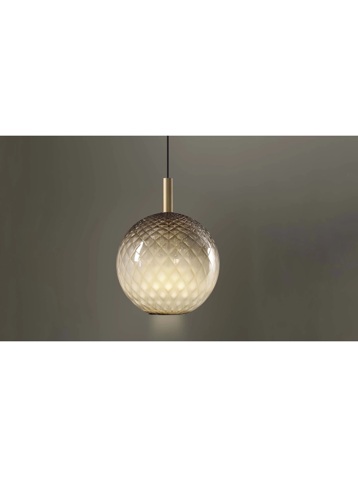 The Beam Stick Nuance Balloton Edition by Olev is a Made in Italy pendant lamp that celebrates the tradition of Murano glassmaking through entirely artisanal craftsmanship. Each sphere is handcrafted using the blown glass technique and features the characteristic embossed Balloton pattern, a woven motif that adds visual depth and an almost textile-like effect, creating captivating plays of light. Concealed within the sphere is a dual LED source that diffuses a soft inward light and a more direct downward beam, offering evocative yet functional lighting. Available in 2700K and 3000K versions, both with a CRI >90, the lamp ensures natural, high-quality light output. The aluminum frame and black cable complete a refined design object, ideal for residential and hospitality environments seeking an exclusive lighting element with high artistic value.
