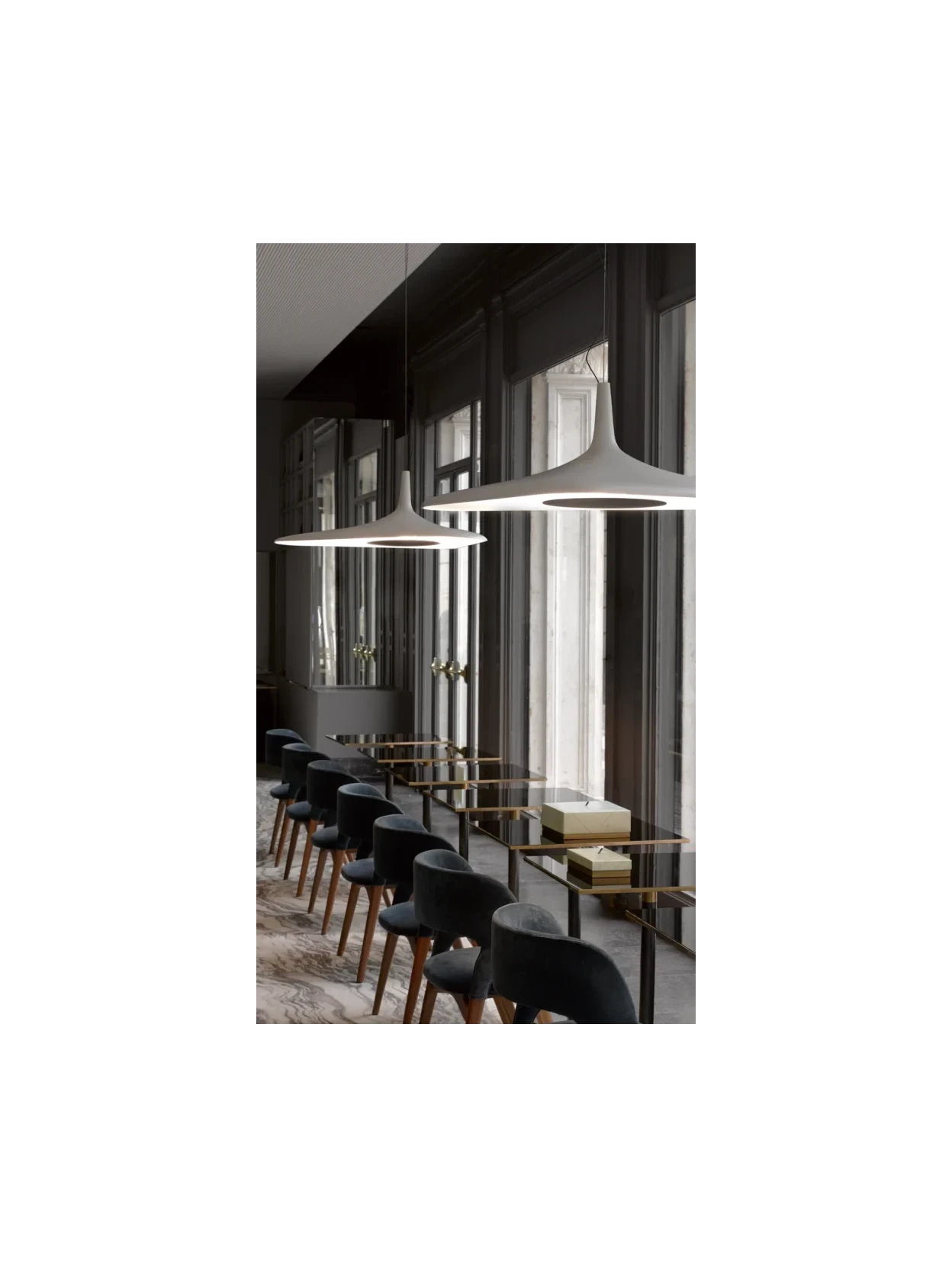 The integrated 35W 3000K LED technology ensures warm and comfortable lighting, while push or DALI dimming allows for intensity adjustment to adapt to any setting, from domestic conviviality to professional environments. Its generous dimensions, combined with the long 3-meter cable and minimalist ceiling rose, make Soleil Noir perfect above a dining table, a kitchen island, or in contract spaces where a decorative element combining sculpture and technology is desired. A suspension lamp that cannot go unnoticed, capable of reinterpreting the very idea of light with an elegant and contemporary language.