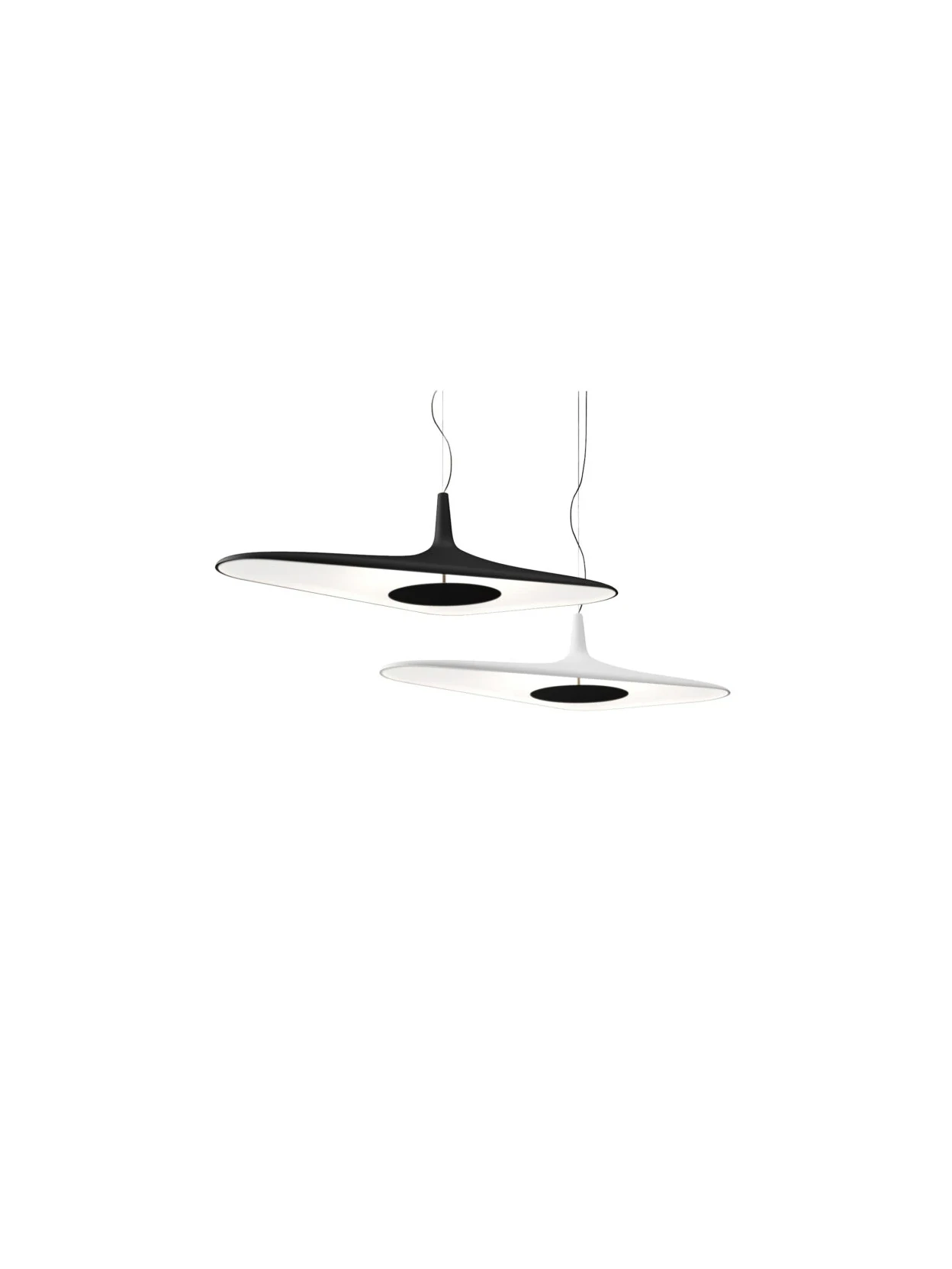 Soleil Noir by Luceplan is a suspension lamp with a contemporary appeal that reinvents decorative lighting with a sinuous, sculptural form. Made of molded polyurethane foam, it appears to float in space like a pure, essential luminous object. The black and white finish enhances its organic silhouette, offering an aesthetic balance that combines visual lightness and bold character in a single solution.