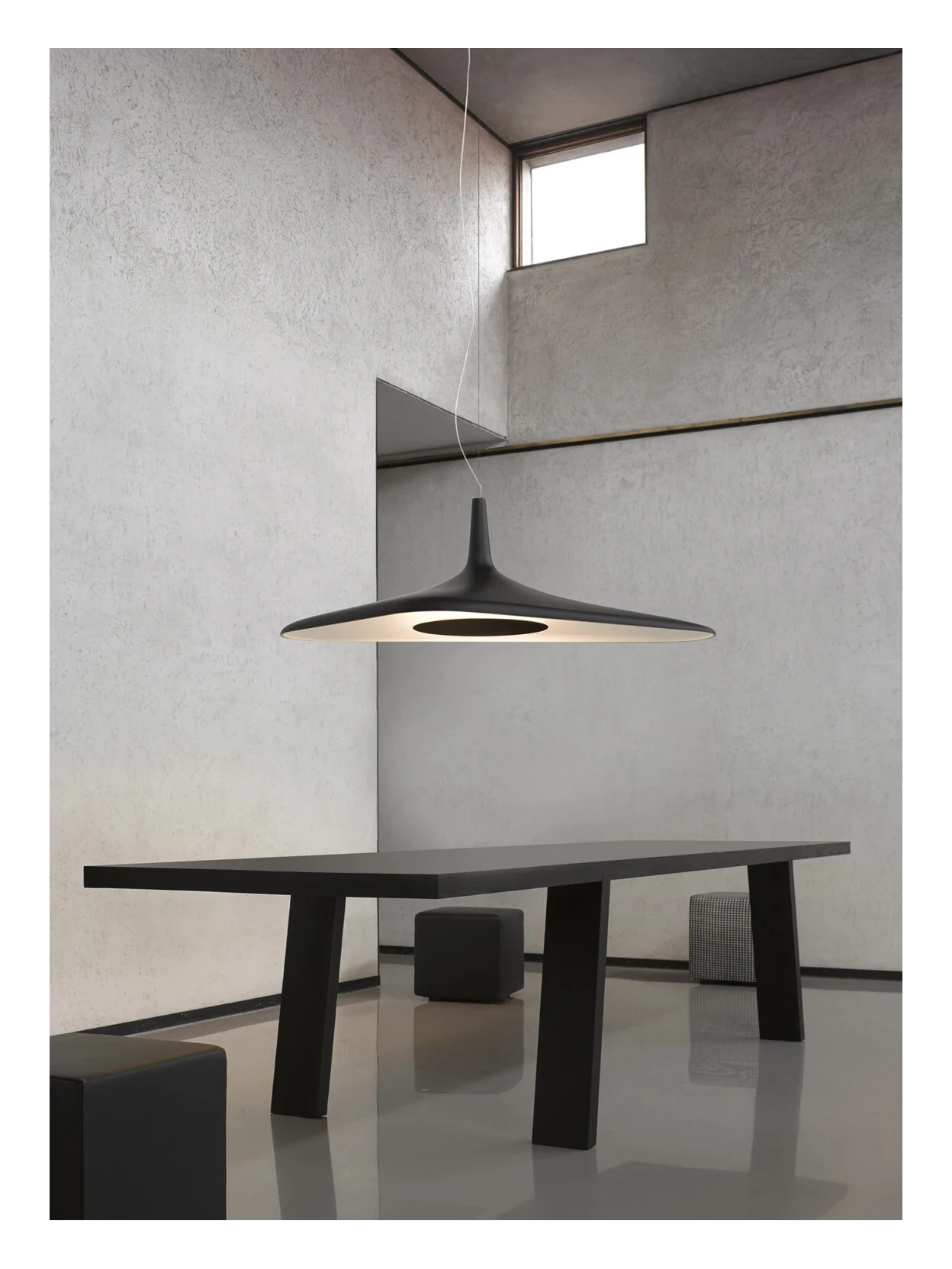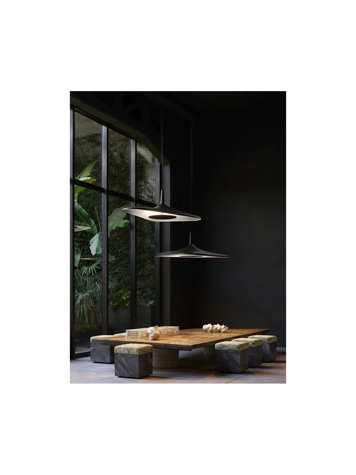 The integrated 35W 3000K LED source diffuses soft, uniform, and glare-free light, ideal for creating welcoming atmospheres in both domestic and professional settings. Push/DALI dimming allows for precise adjustment of light intensity, while its generous dimensions and 3-meter cable allow for dramatic installations above tables, kitchen islands, or lounge areas. Elegant, technological, and surprising, Soleil Noir is a suspension lamp that takes center stage while maintaining balance and harmony.