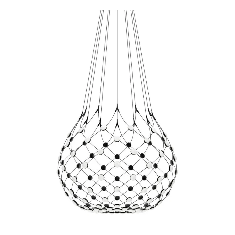 Mesh Ø100 cm is the most dramatic version of the celebrated pendant lamp, designed to dominate space with elegance and lightness. The nearly transparent steel mesh houses a constellation of micro-LEDs that diffuse a pure, enveloping light, capable of transforming any space. In addition to control via phase cut and the CASAMBI system, Mesh Ø100 integrates wireless technology that, thanks to a dedicated app, allows for the freedom to adjust intensity, zones, and atmospheres. With its 100 cm diameter and adjustable cables up to 5 meters, it becomes the ideal focal point of living rooms, lobbies, and contract spaces, offering an impeccable blend of innovative design and superior lighting performance.