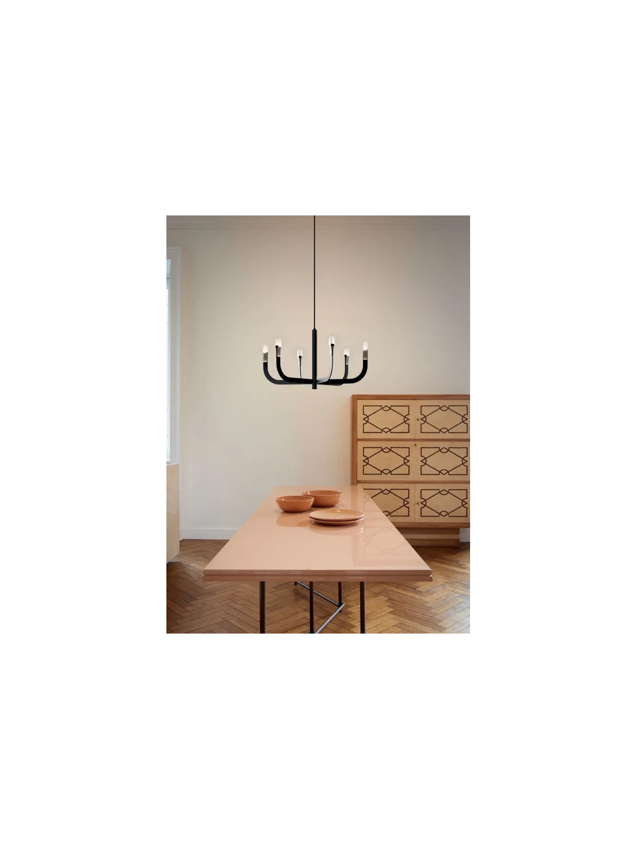 The warm, high-performance 21W 2700K LED light diffuses uniform illumination, enhancing the space without weighing it down. The chandelier is available in matte black and satin gold finishes, allowing it to adapt to modern or more classic settings with style and refinement. The dimmable options with push, DALI, or phase-cut offer maximum control over the atmosphere, making the J-us a versatile and highly dramatic choice. Choosing J-us means bringing a sophisticated design element into your home or office, capable of combining aesthetics, functionality and a memorable scenic effect.