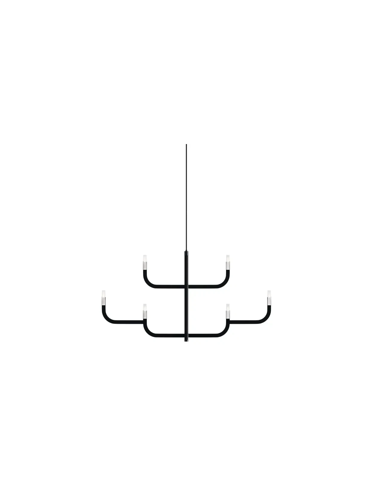 The J-us pendant lamp by Luceplan, designed by Alessandro Zambelli, reinvents the traditional chandelier with slender lines and a bold profile. The central cylindrical structure with an electrified track allows for the free positioning of the single or double arms, creating highly impactful, customized compositions. The warm LED light enhances any interior with elegance and visual lightness.
