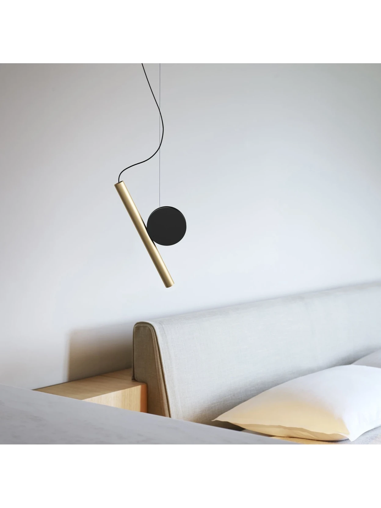 The Doi Suspension Lamp A by Luceplan, in the Black frame version with smooth Brass diffuser, belongs to the Doi family, designed by Meneghello Paolelli, which combines minimalist design and modular functionality. The suspension lamp is composed of an aluminum diffuser cylinder and a disc, whose interplay of counterweights and magnetic attachments allows for different configurations and the ability to direct the light beam as desired, either upward or downward.