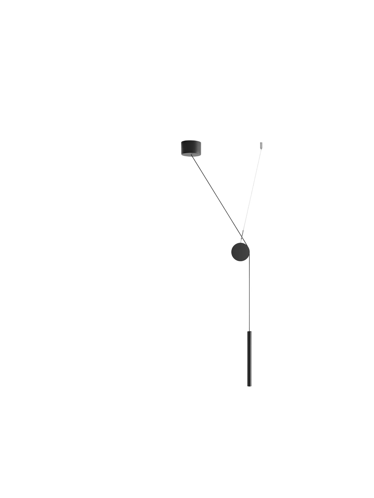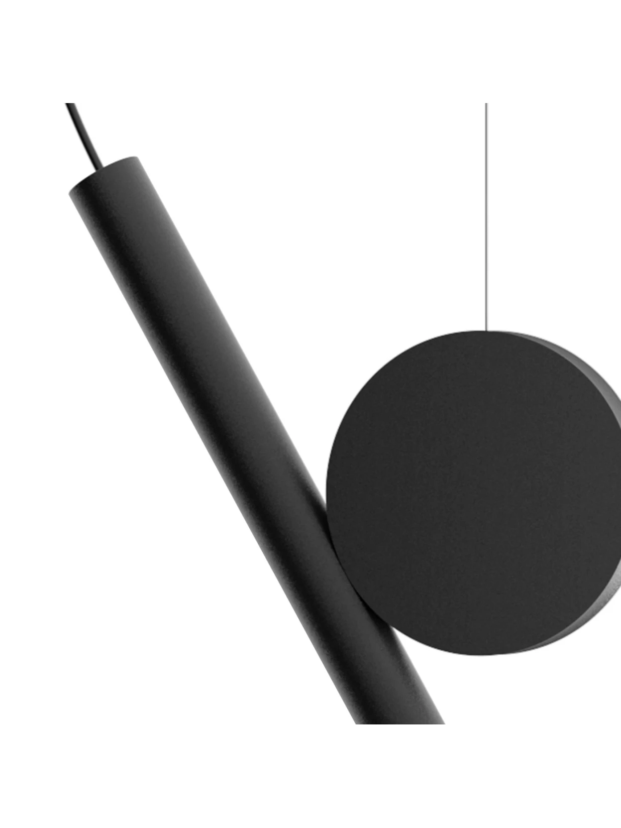 The system is based on the interaction between the disc and the diffuser cylinder, connected by magnetic hooks and counterweights, which allow the light beam to be directed upward or downward according to design needs. The black finish enhances the suspension's minimalist character, making it ideal for contemporary, residential, and contract settings.