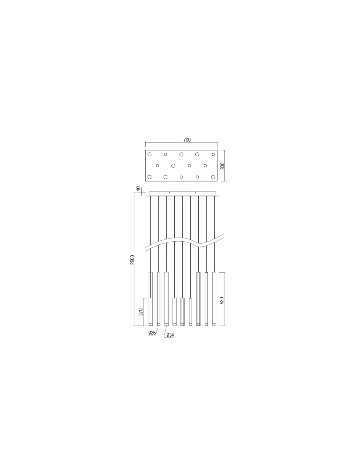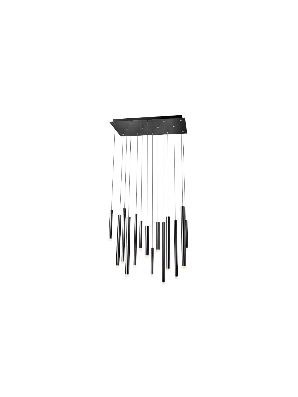 Multiple pendant lamp made of metal and brushed aluminum anodized matt black and transparent acrylic diffusers.