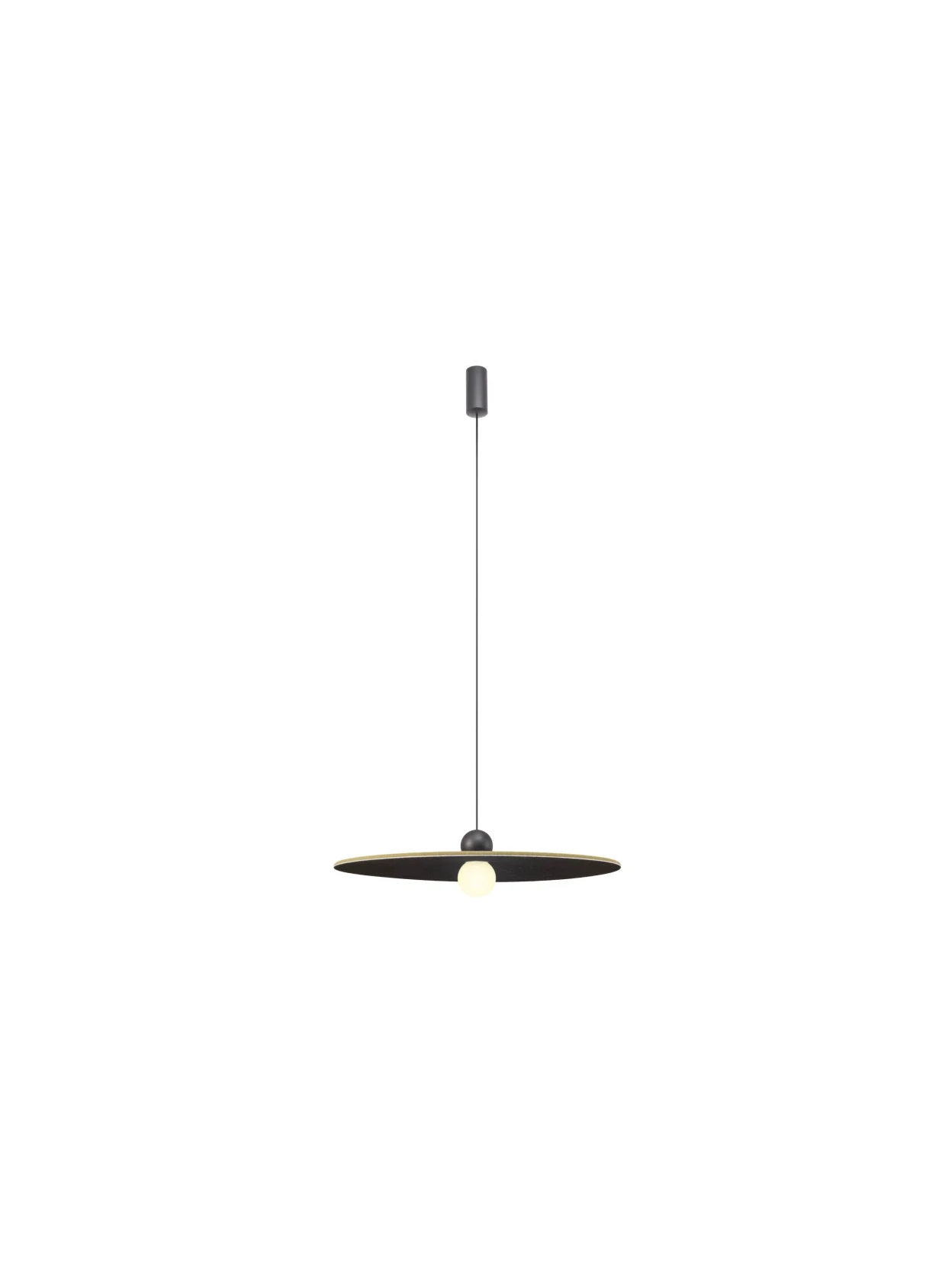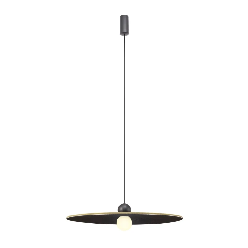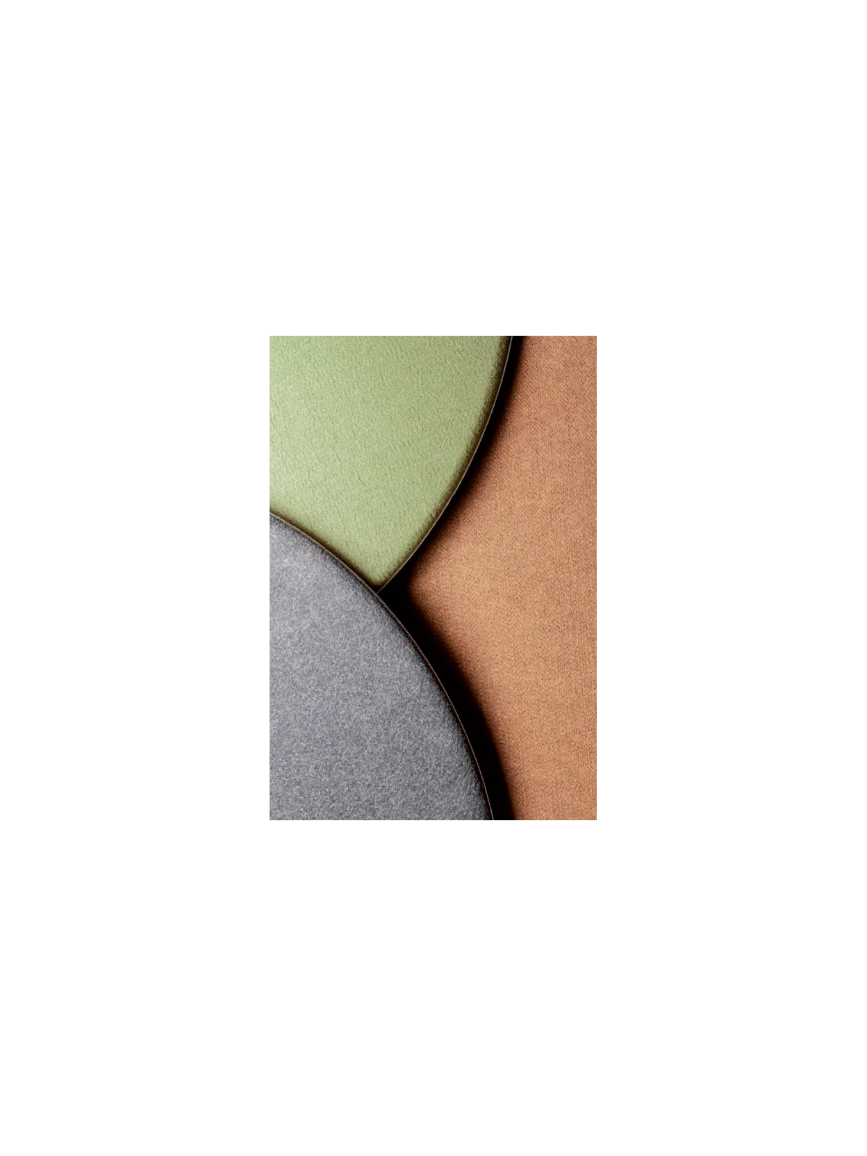 Nuwa by Redo Group is a pendant lamp designed to combine aesthetics, functionality, and acoustic comfort. The frame is made of matte black painted aluminum, complemented by a decorative sphere in a matching color. The lampshade, made of sound-absorbing polyethylene terephthalate felt, features an olive green exterior and black interior, offering a distinctive design and improved sound absorption. The opal white blown glass diffuser diffuses the light softly and evenly, creating a welcoming atmosphere.