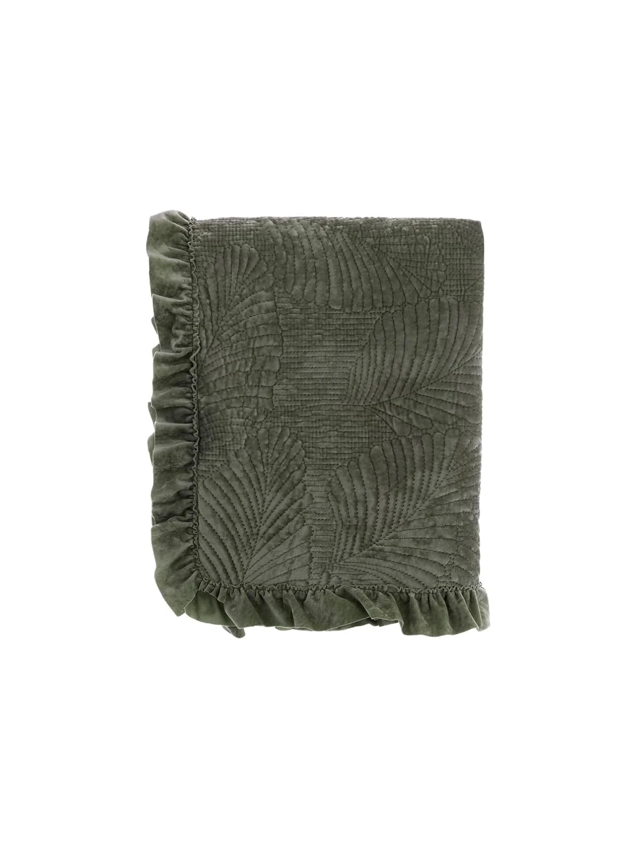 Add a warm and elegant touch to your bedroom with this green velvet double duvet from the Foliage Velvet series. Featuring sophisticated leaf quilting and ruffles on three sides, it measures 260 x 260 cm and is made of 100% polyester velvet. It comes with a handy fabric bag.