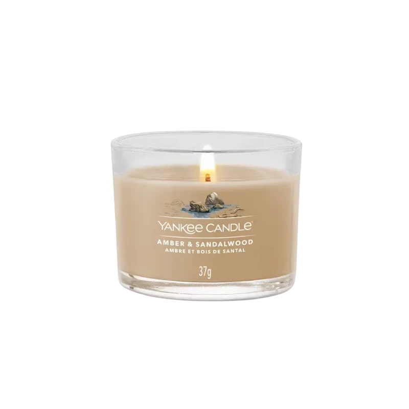 Yankee Candle Amber & Sandalwood is a votive candle in a glass with a sweet and spicy fragrance that evokes calm, nature, and freedom. Immerse yourself in the warmth of a secluded beach, where sun-kissed sand meets the soothing notes of driftwood, cardamom, and amber. Amber & Sandalwood opens with vibrant accents of pepper and cardamom, followed by a soft heart of velvety amber and lavender. The warm and enveloping base notes combine sandalwood, cedarwood, and a delicate touch of vanilla, creating a serene and welcoming atmosphere.