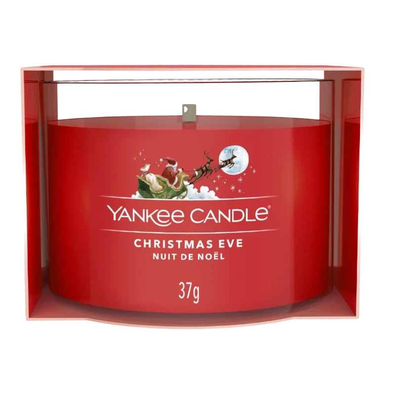 Yankee Candle's Christmas Eve is a votive candle in a glass that captures all the magic of Christmas Eve: the warmth of a roaring fireplace, the sweetness of sugared plums, and the indulgence of candied fruit. An enveloping blend of spices, citrus, and vanilla fills the air with excitement and anticipation. The celebration begins with the scent.