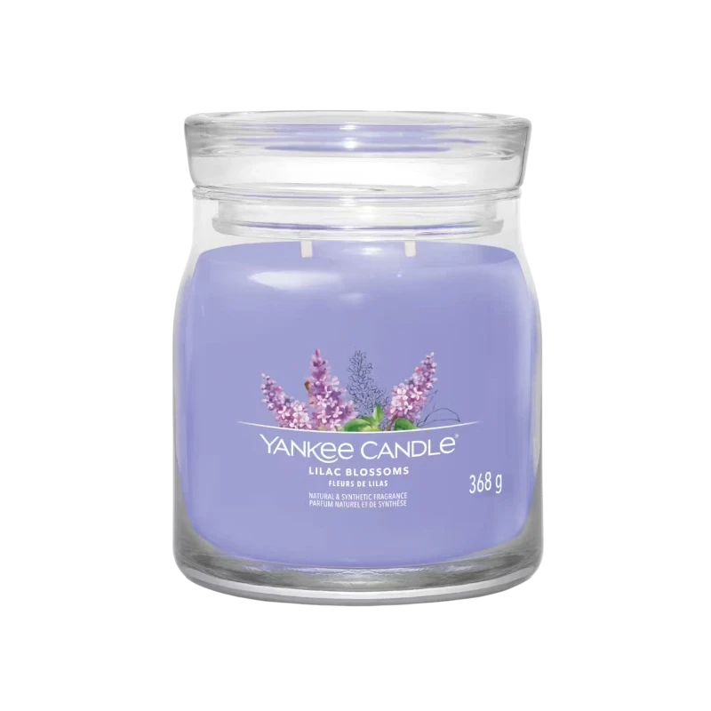Yankee Candle's Lilac Blossoms is a medium jar candle; a fragrance that captures the elegance and freshness of lavender fields and white and purple lilacs. Top notes of bergamot, lily, and green nuances open the composition with a bright and airy freshness, reminiscent of a stroll in the first days of spring. At the heart, a floral symphony of lilac petals, hyacinth, and tulips imparts a rich, soft, and delicately deep scent. Finishing with an elegant and reassuring base of cedar leaves, vetiver, and musk, it envelops the room with a sense of natural tranquility. It's the ideal choice for those who love sophisticated and enveloping floral fragrances, perfect for creating a relaxing, harmonious, and graceful atmosphere.