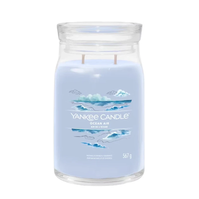 Yankee Candle's Ocean Air is a large jar candle that captures the essence of a perfect afternoon at the beach: the crystal-clear salt air intertwines with ozonic notes that evoke cleanliness and freedom. The floral heart of jasmine lends a delicate and refined touch, while white amber and sandalwood envelop the senses in a warm, soft, and relaxing trail. A rejuvenating olfactory experience that transforms any room into a timeless coastal retreat.