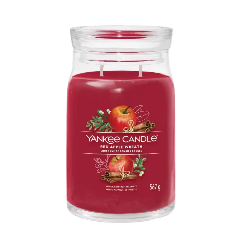Yankee Candle's Red Apple Wreath is a large jar candle that welcomes you with the warmth of the holidays. Top notes of golden apples, cinnamon leaf, and cloves open the fragrance with a spicy, fruity touch. The heart of apple zest, chopped walnuts, and brown sugar lends a sense of sweet tradition, while the creamy base of amber, melted butter, maple syrup, and vanilla envelops the room in a festive embrace. A fruity fragrance that celebrates the pleasure of returning home and experiencing the magic of Christmas with loved ones.
