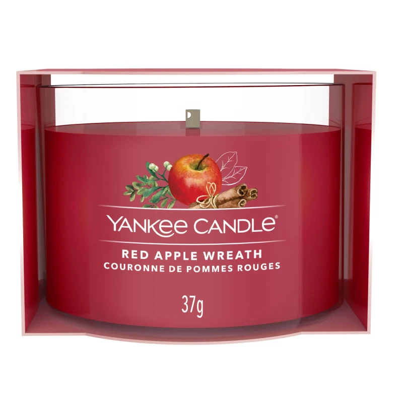 Yankee Candle's Red Apple Wreath is a votive candle in a glass jar that welcomes you with the warmth of the holidays. Top notes of golden apples, cinnamon leaf, and cloves open the fragrance with a spicy, fruity touch. The heart of apple zest, chopped walnuts, and brown sugar lends a sense of sweet tradition, while the creamy base of amber, melted butter, maple syrup, and vanilla envelops the room in a festive embrace. A fruity fragrance that celebrates the pleasure of returning home and experiencing the magic of Christmas with those you love.