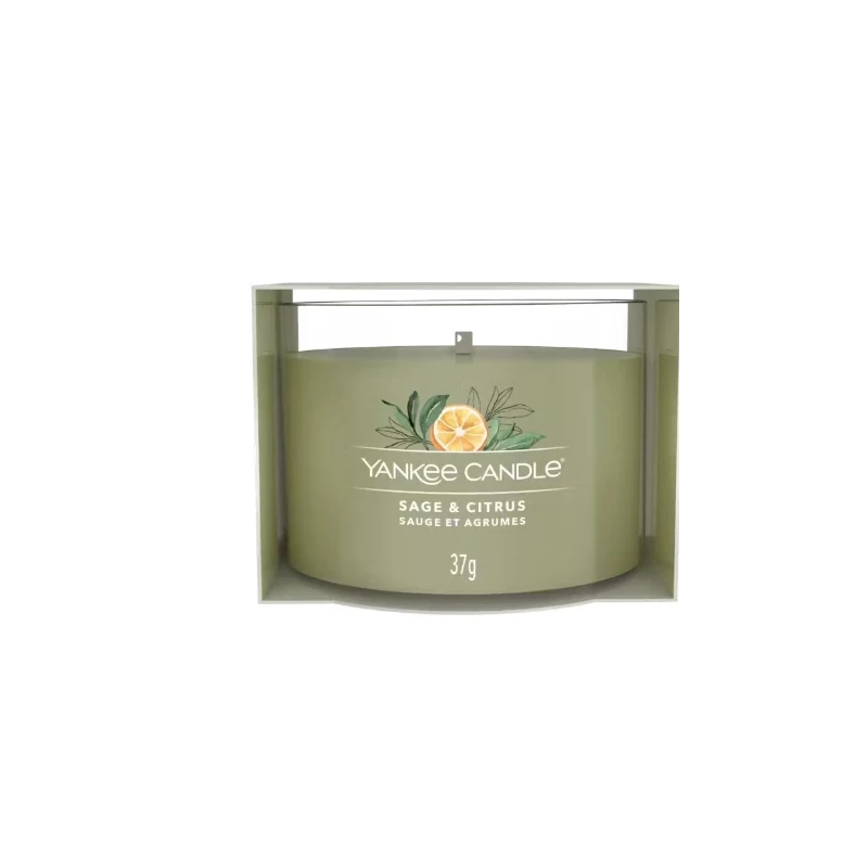 Yankee Candle's Sage & Citrus is a votive candle in a glass jar that celebrates the harmony of nature: vibrant citrus top notes blend with herbaceous accents and lavender, opening the way to a refined heart of geranium and lavender. At the base, the depth of patchouli intertwines with soft powdery notes, musk, and warm woods. A perfect balance of freshness and warmth, energy and tranquility: a citrusy and earthy fragrance designed to bring serenity and well-being to any space.
