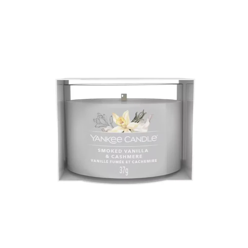Smoked Vanilla & Cashmere by Yankee Candle is a votive candle in a glass jar where vanilla comes to life in a sweet and spicy fragrance, further enveloping with smoky notes, soft cashmere, and warm amber. Top notes of brown sugar, blackcurrant, and caramelized marshmallow open sweetly. The deep heart of smoky cinnamon, vanilla, and cloves intertwines with delicate nuances of charcoal and cashmere. The base notes of melted amber, creamy musk, and precious woods complete this welcoming sensory experience. A fragrance that envelops the room like a warm blanket on winter evenings, perfect for creating a cozy and relaxing atmosphere.